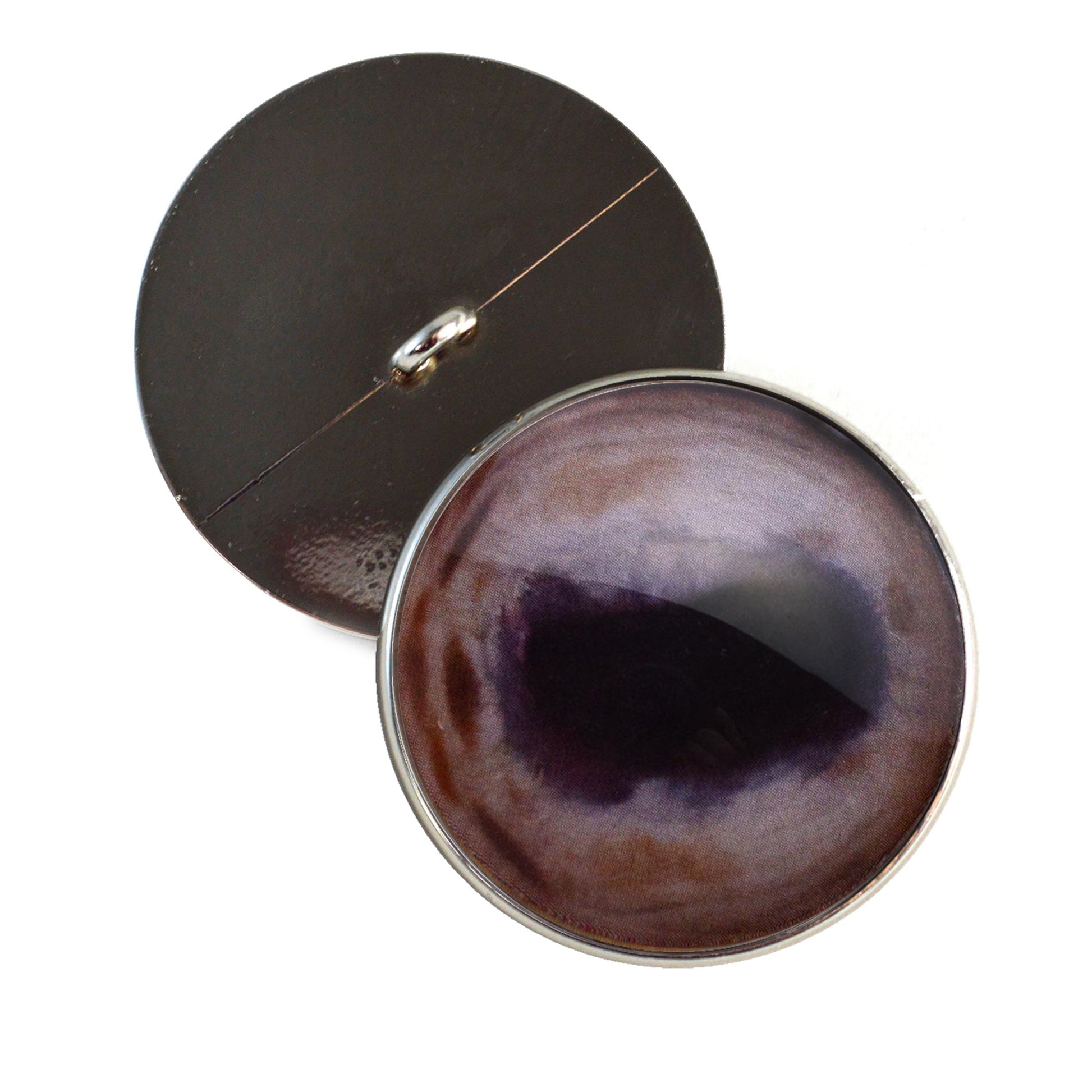 These glass eye cabochons are set in silver toned metal button bezels with sew-on loops on their backs. These sew-on glass eyes are perfect for soft sculptures, plushies, stuffed animals, and as buttons for unique clothing.