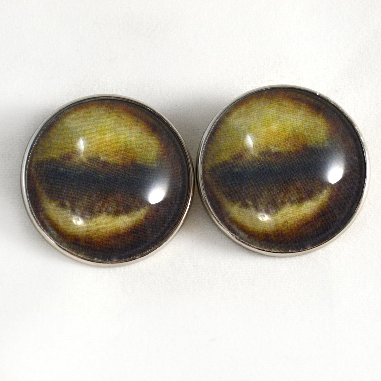 These glass eye cabochons are set in silver toned metal button bezels with sew-on loops on their backs. These sew-on glass eyes are perfect for soft sculptures, plushies, stuffed animals, and as buttons for unique clothing.