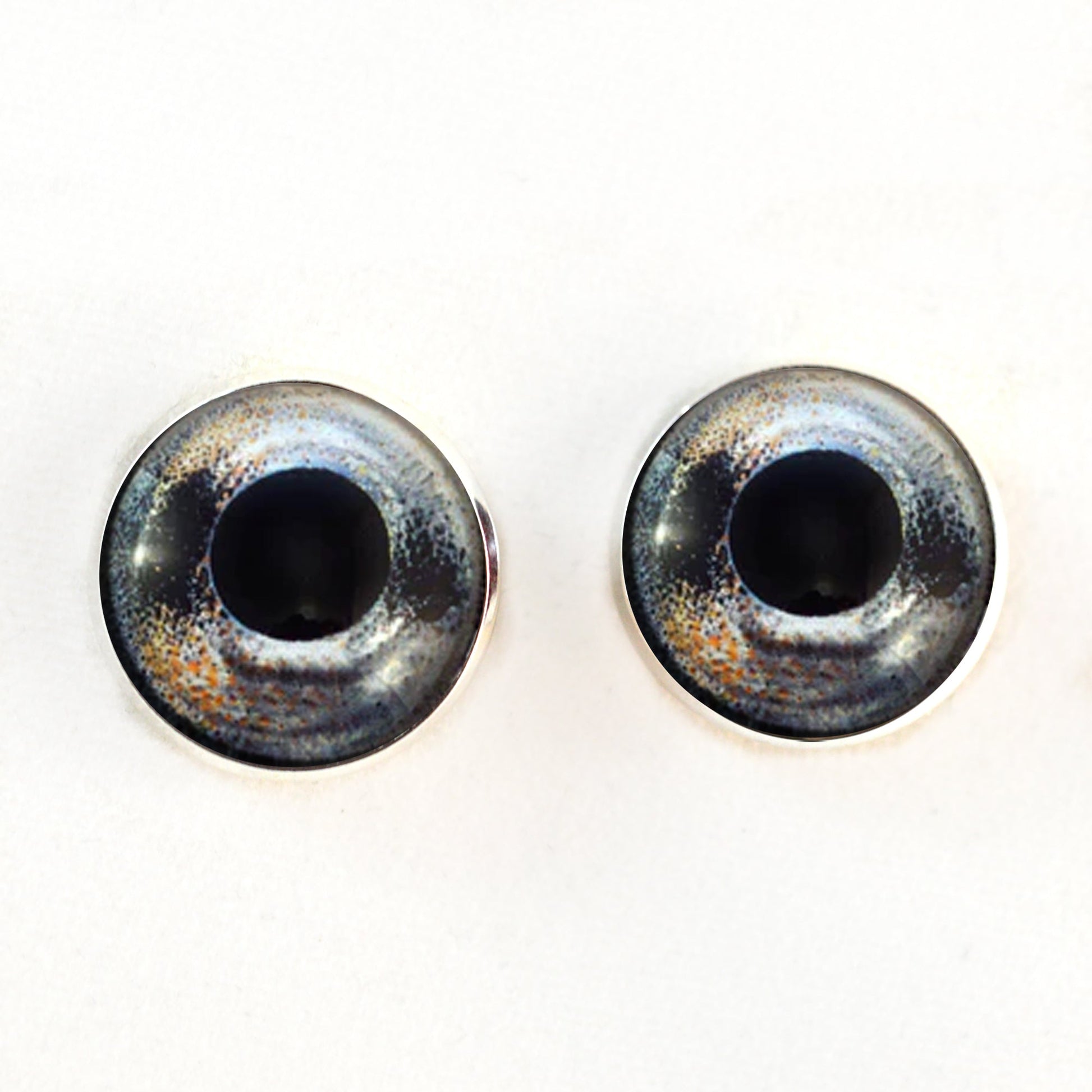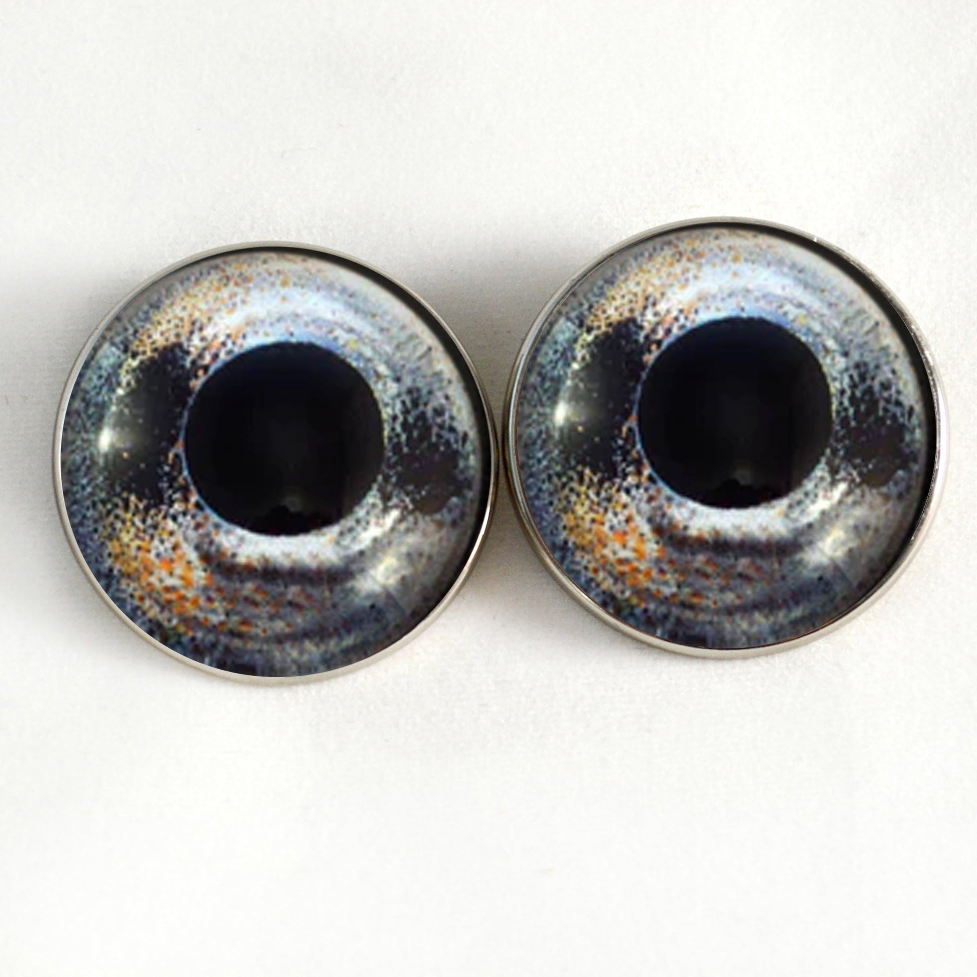 These glass eye cabochons are set in silver toned metal button bezels with sew-on loops on their backs. These sew-on glass eyes are perfect for soft sculptures, plushies, stuffed animals, and as buttons for unique clothing.