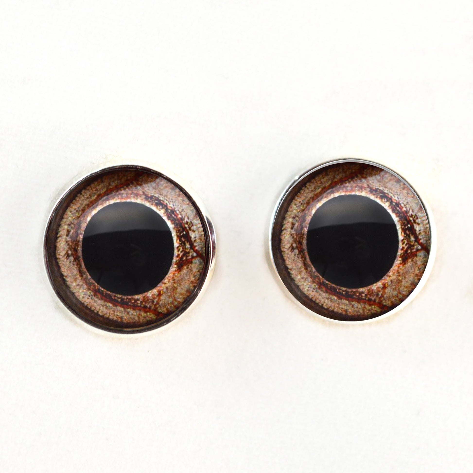 These glass eye cabochons are set in silver toned metal button bezels with sew-on loops on their backs. These sew-on glass eyes are perfect for soft sculptures, plushies, stuffed animals, and as buttons for unique clothing.