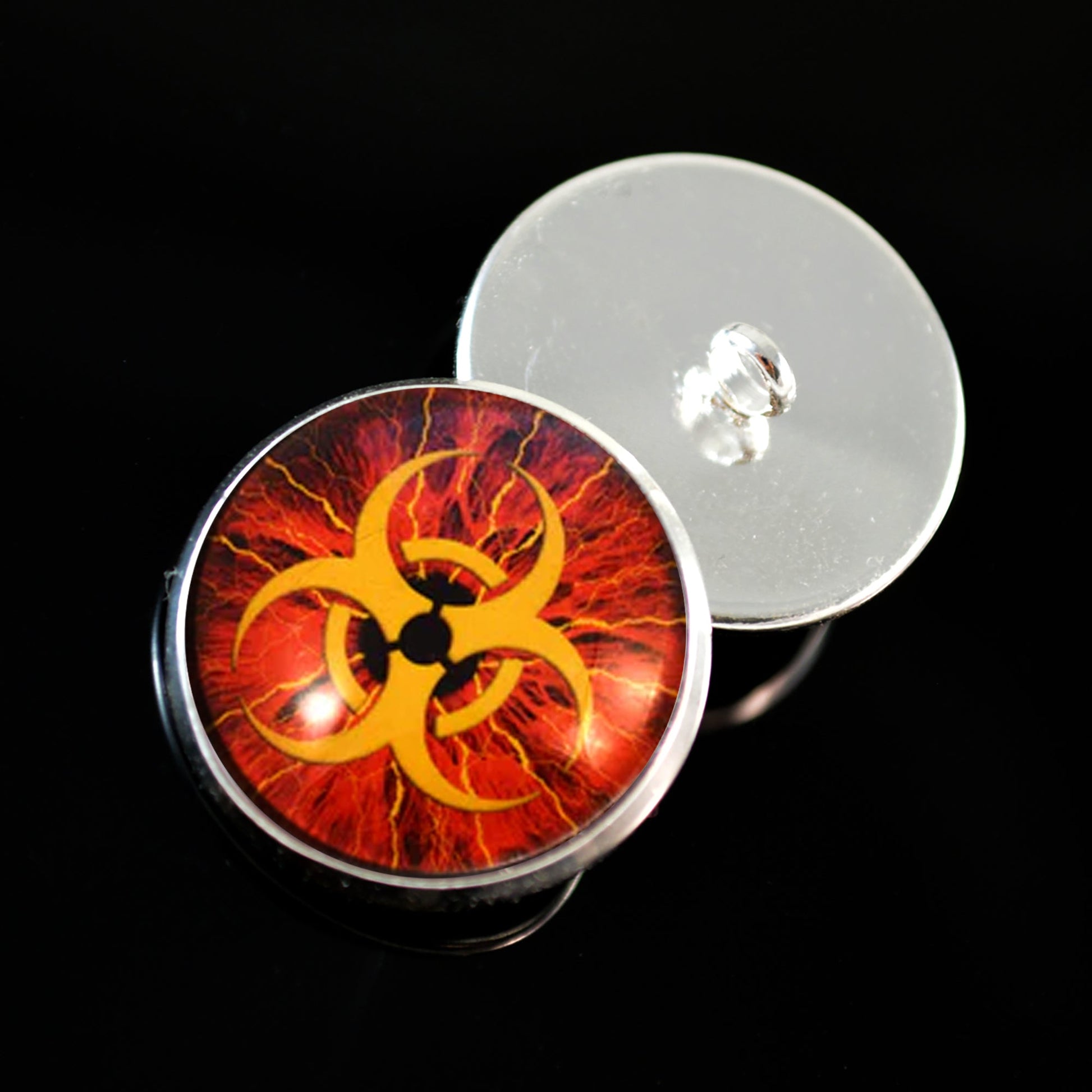This glass eye design contains a round black pupil underneath a yellow biohazard logo and red and yellow crackle iris design.