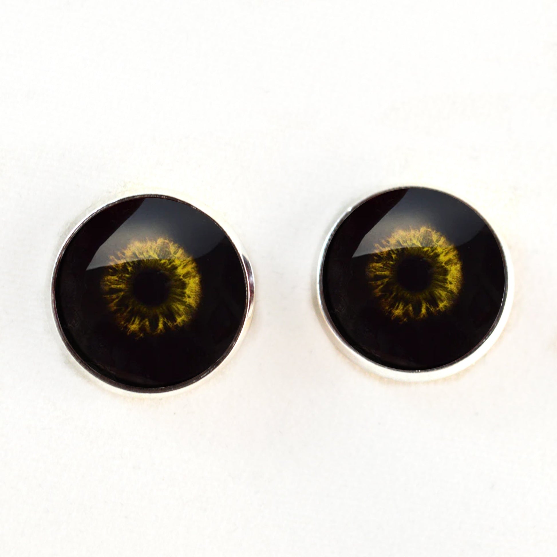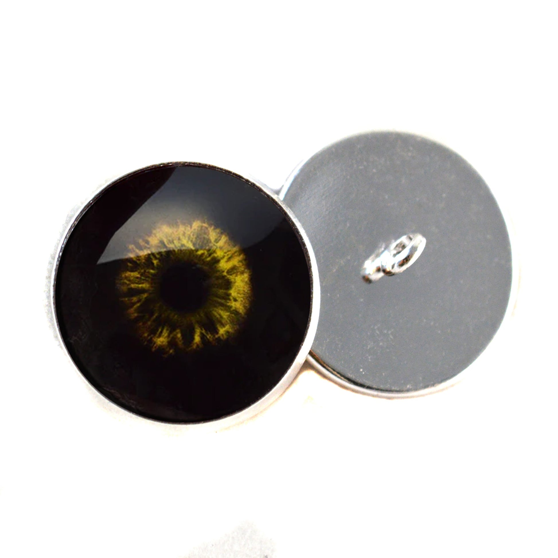 These glass eyes are buttons with loops on the back of their silver-colored metal settings. This pair of glass eyes is perfect for creating your stuffed or crochet animal creature or soft sculpture, or for use in creative jewelry making.