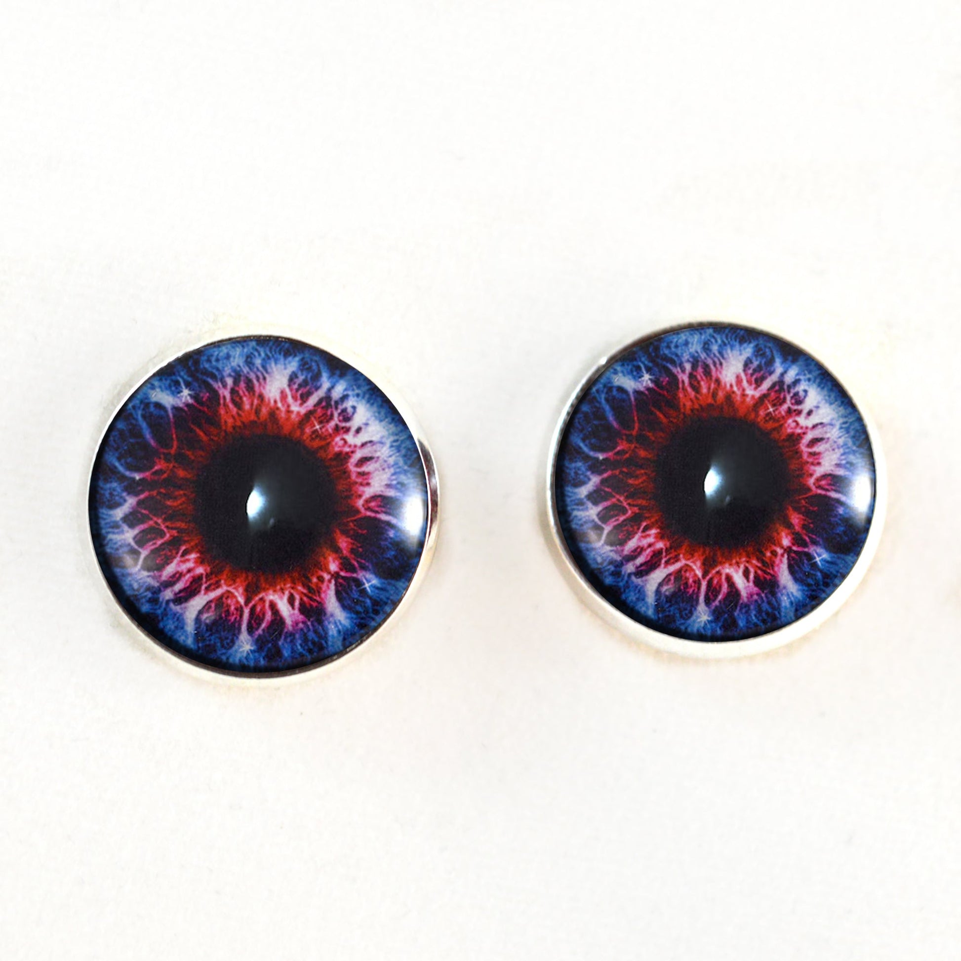 Pick or size of 10mm, 16mm, 25mm, or 30mm for a pair of sew on glass button eyes. These handmade fantasy blue and red eyes add complex life to your creations, with their fantastic details.