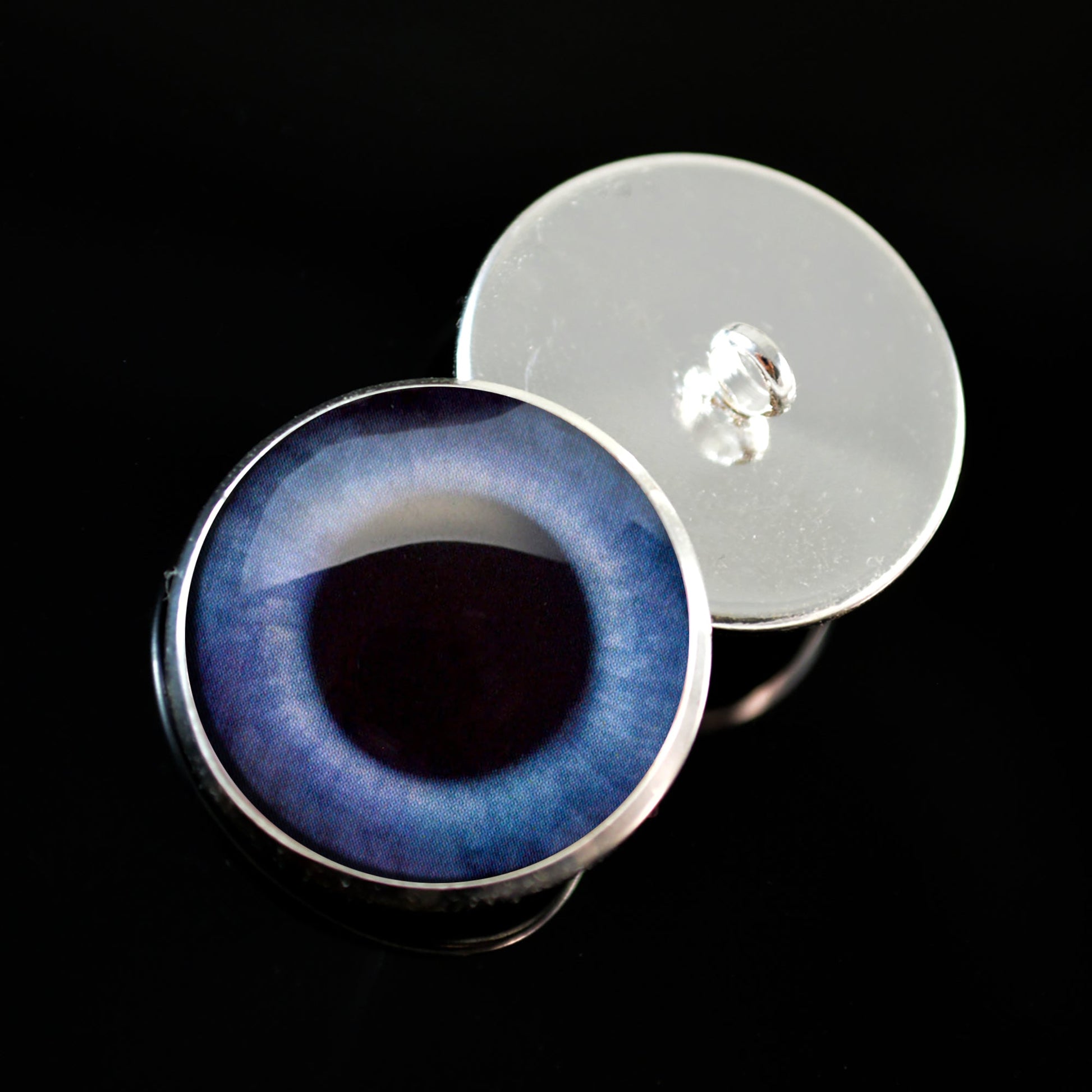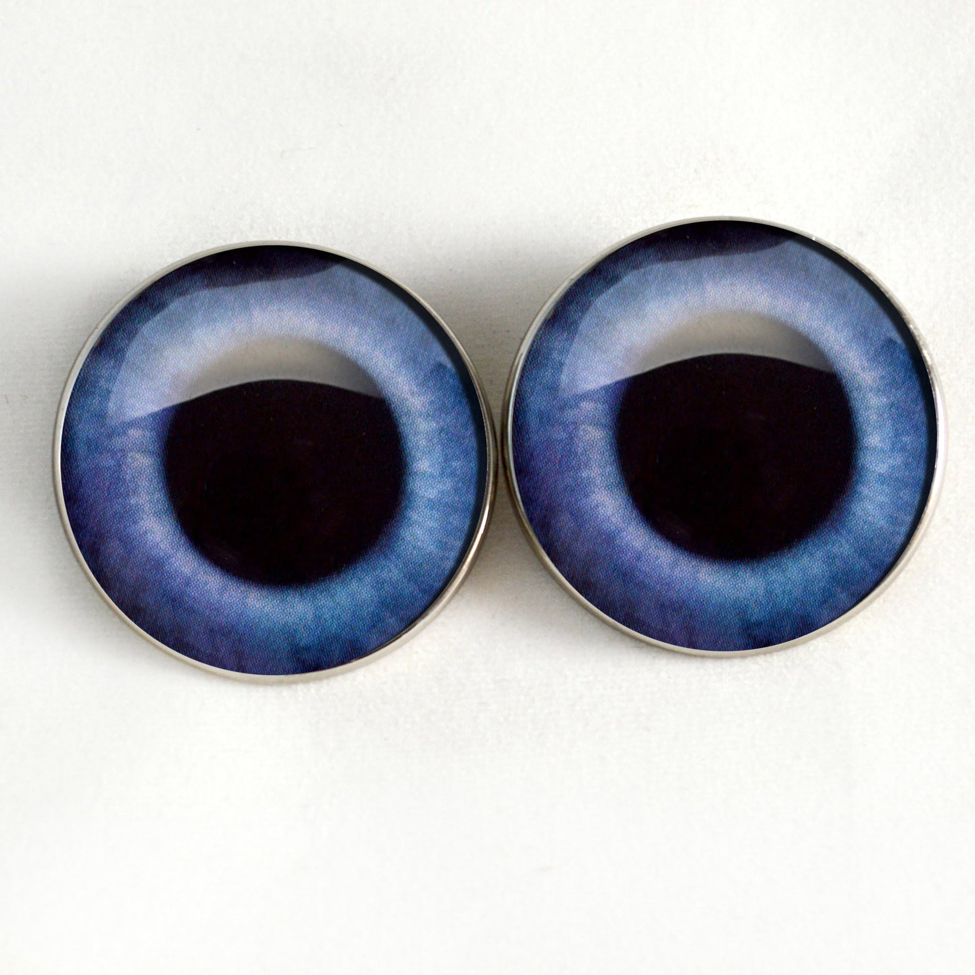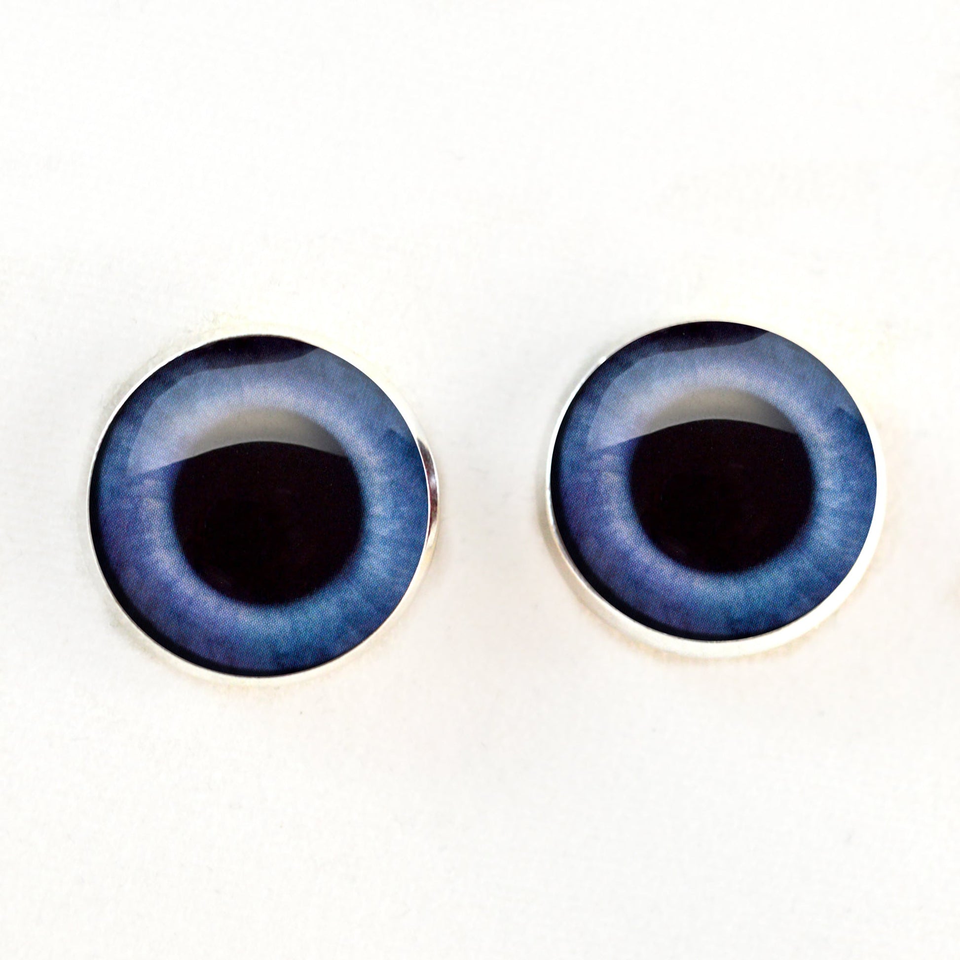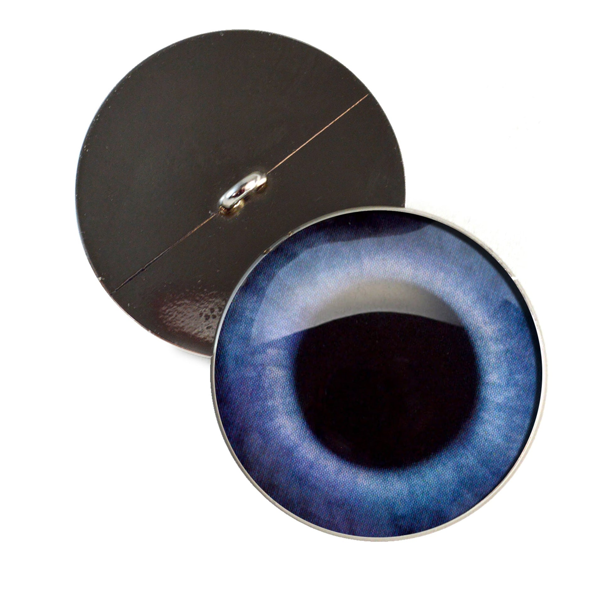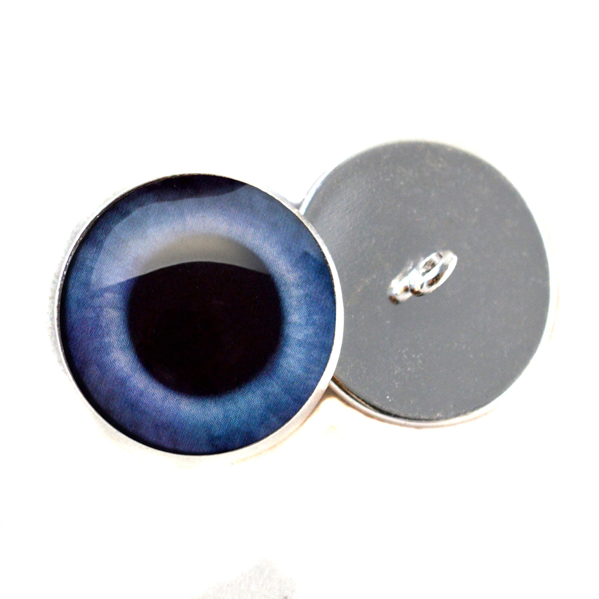 These glass eye cabochons are set in silver toned metal button bezels with sew-on loops on their backs. These sew-on glass eyes are perfect for soft sculptures, plushies, stuffed animals, and as buttons for unique clothing.