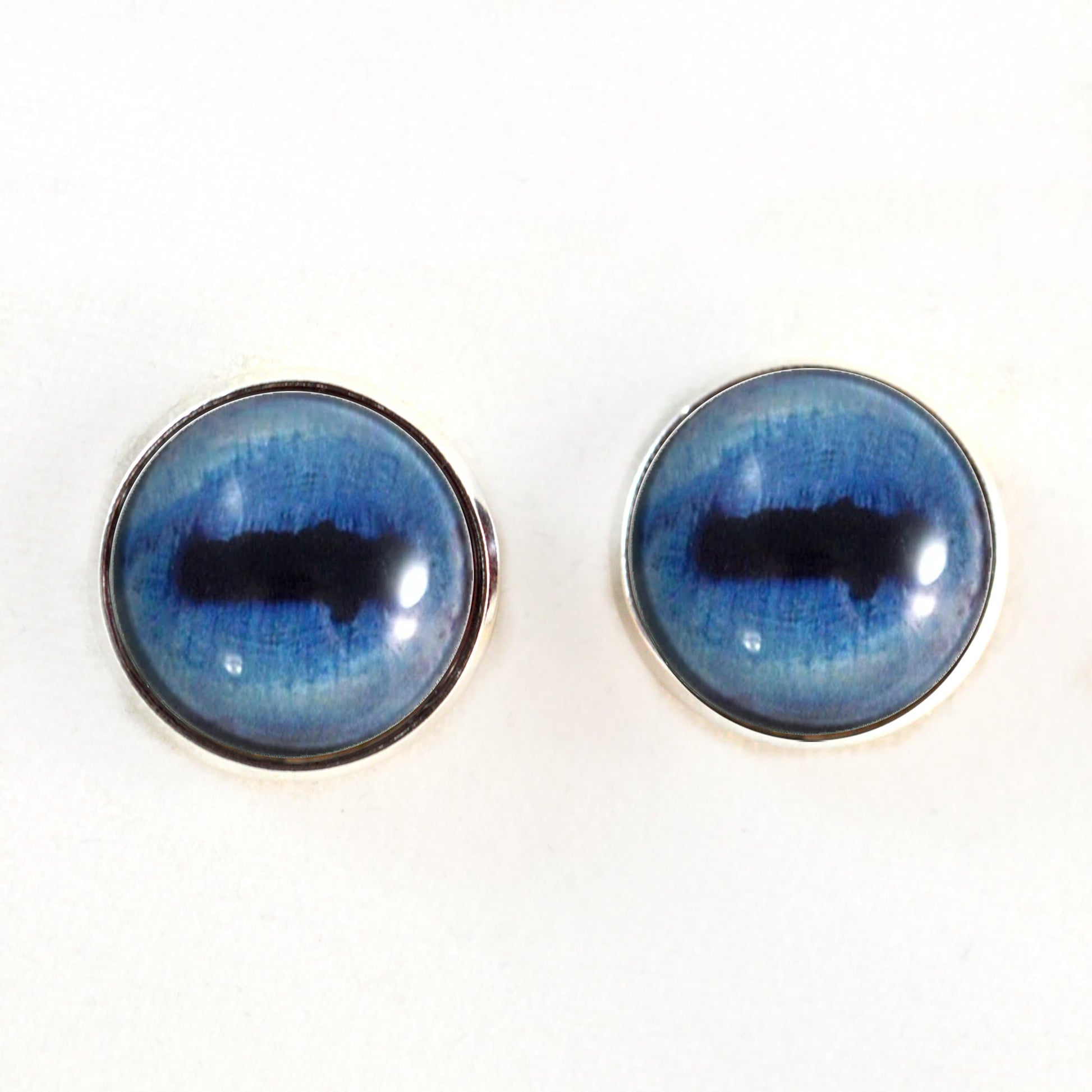 These glass eye cabochons are set in silver toned metal button bezels with sew-on loops on their backs. These sew-on glass eyes are perfect for soft sculptures, plushies, stuffed animals, and as buttons for unique clothing.