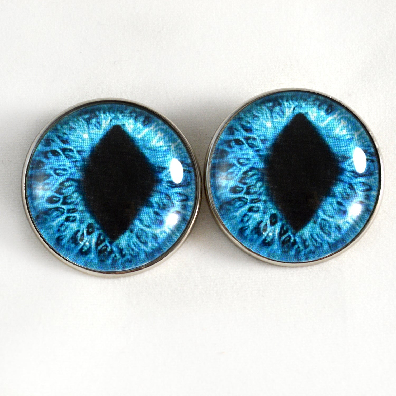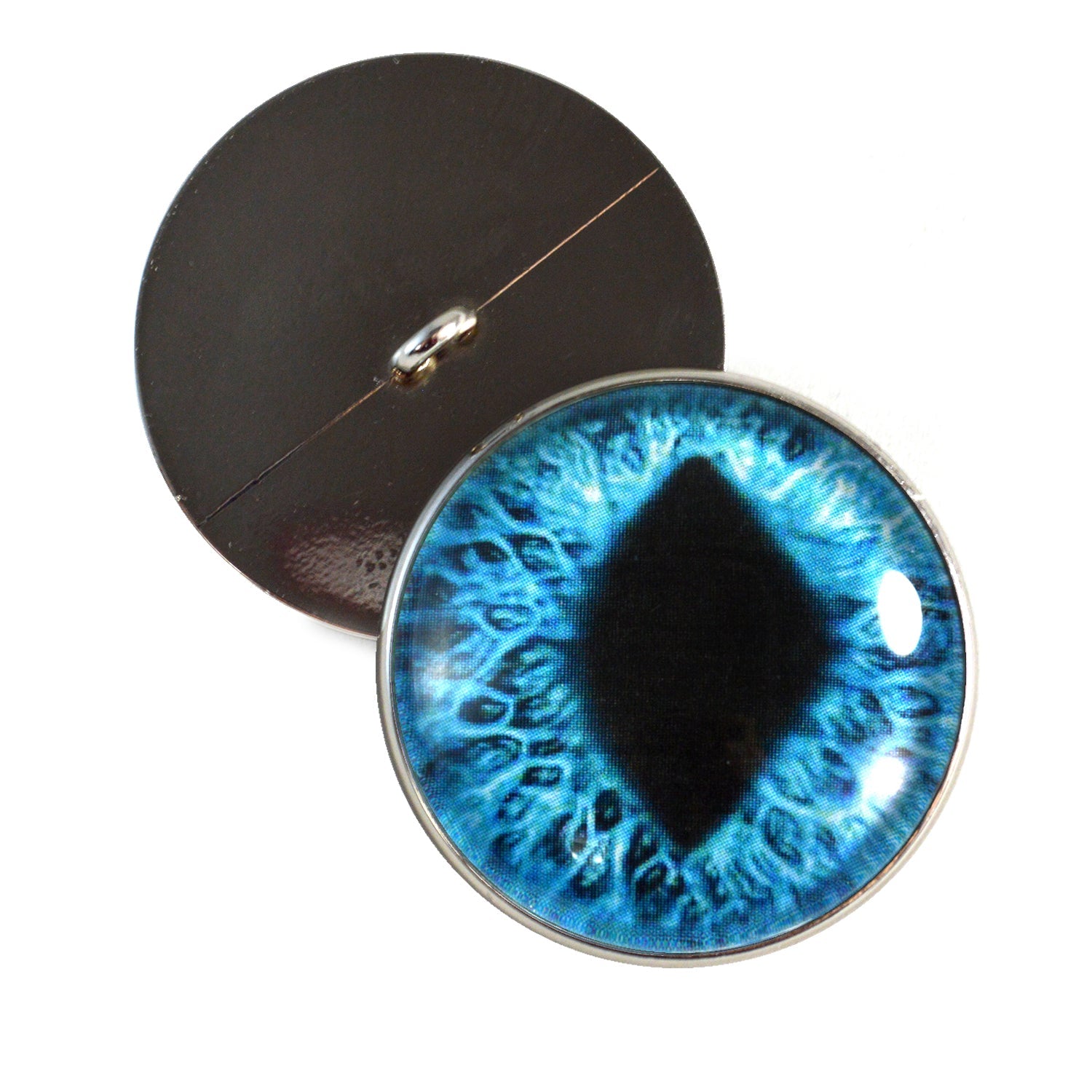 These glass eye cabochons are set in silver toned metal button bezels with sew-on loops on their backs. These sew-on glass eyes are perfect for soft sculptures, plushies, stuffed animals, and as buttons for unique clothing.