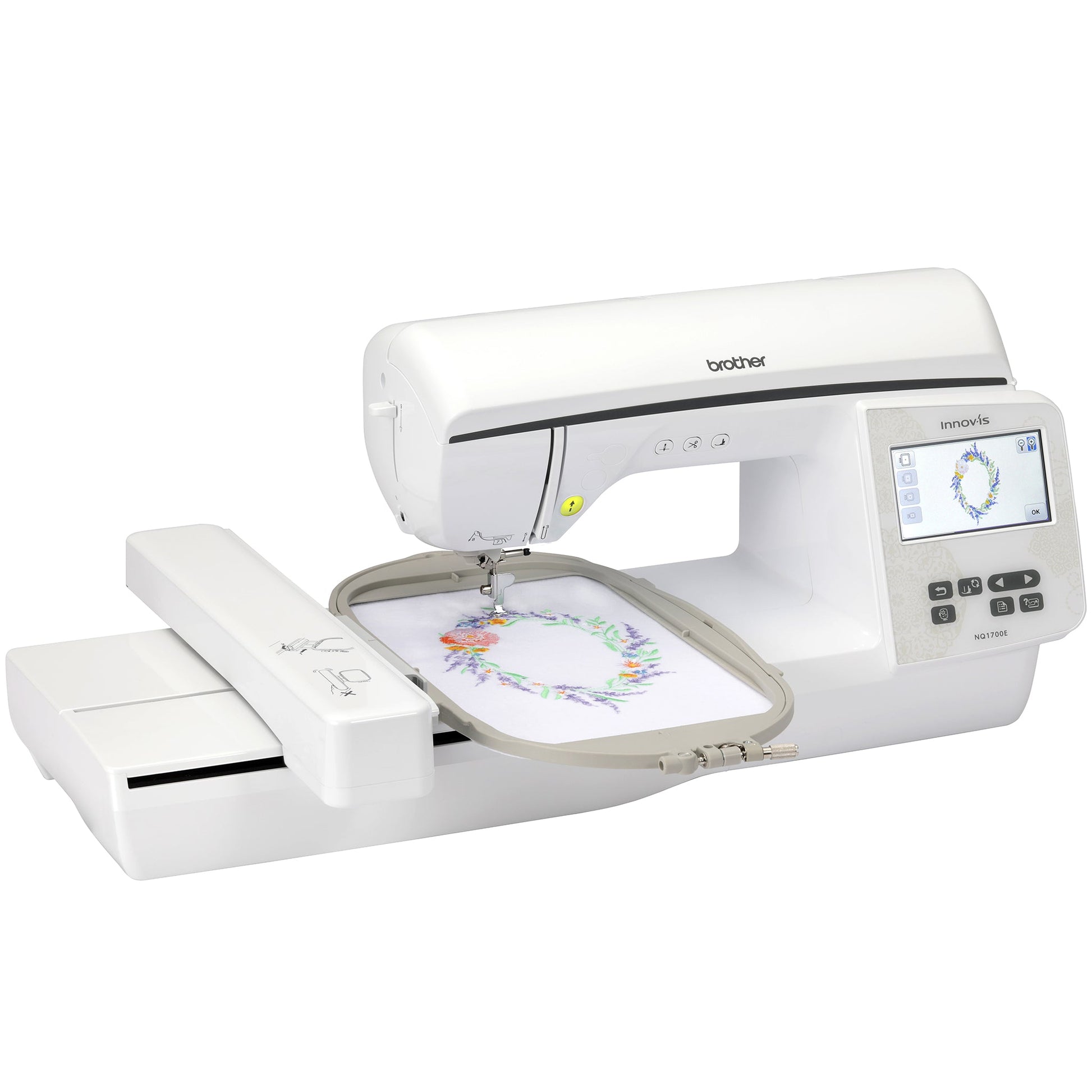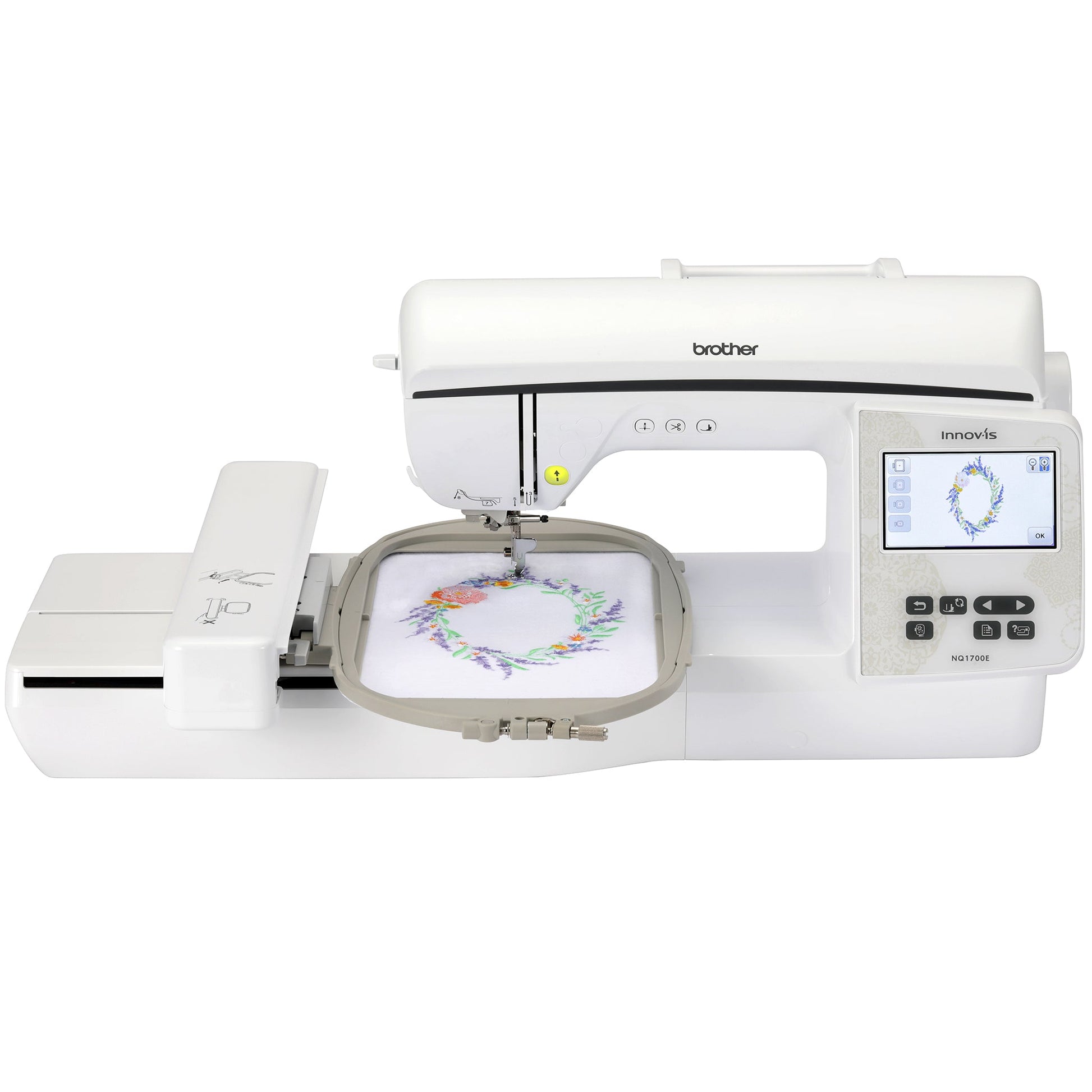 The Brother Innov-ís NQ1700E Embroidery Machine is a cutting-edge tool tailored for both hobbyists and professional embroiderers seeking precision and versatility. This advanced embroidery machine boasts a generous 6" x 10" embroidery area, allowing users to create large, intricate designs with ease. Equipped with 258 built-in embroidery designs and 140 frame pattern combinations, the Innov-ís NQ1700E offers a vast palette of creative possibilities. Its color LCD touchscreen makes selecting and editing designs a breeze, providing a user-friendly interface that simplifies complex tasks. Additionally, the machine features an advanced needle threading system and an automatic thread cutter, enhancing efficiency and reducing manual effort.