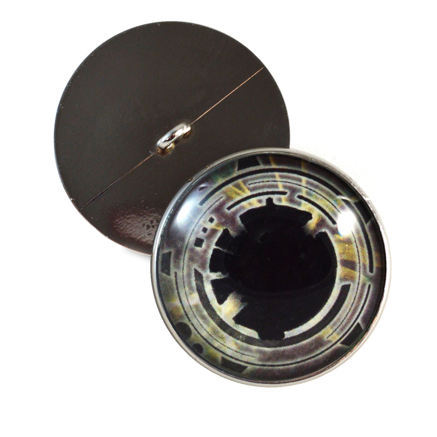 These glass eye cabochons are set in silver toned metal button bezels with sew-on loops on their backs. These sew-on glass eyes are perfect for soft sculptures, plushies, stuffed animals, and as buttons for unique clothing.