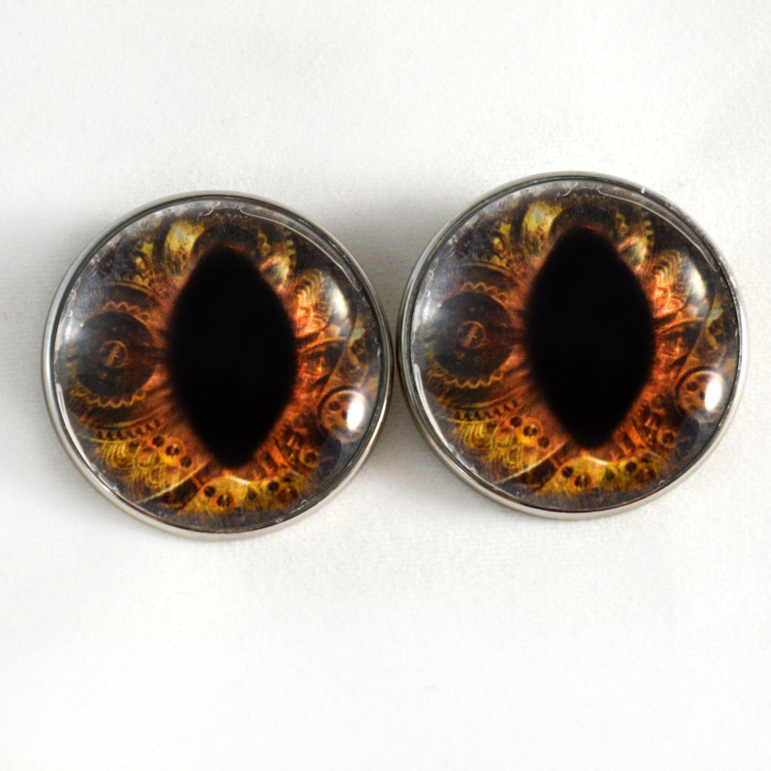 These captivating sew on button glass eyes depict hypnotic, steampunk cat or dragon eyes in brown.
