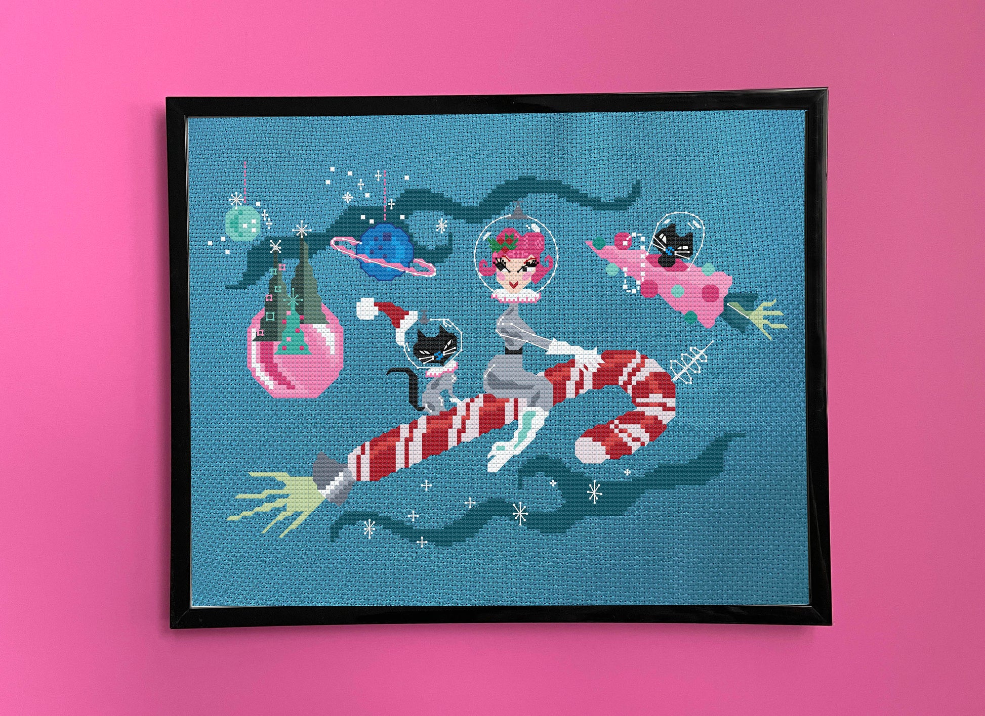 Candy Cane Rocket Girl counted cross stitch kit with artwork by Claudette Barjoud a.k.a Miss Fluff and transformed into cross stitch delight by Spot Colors.