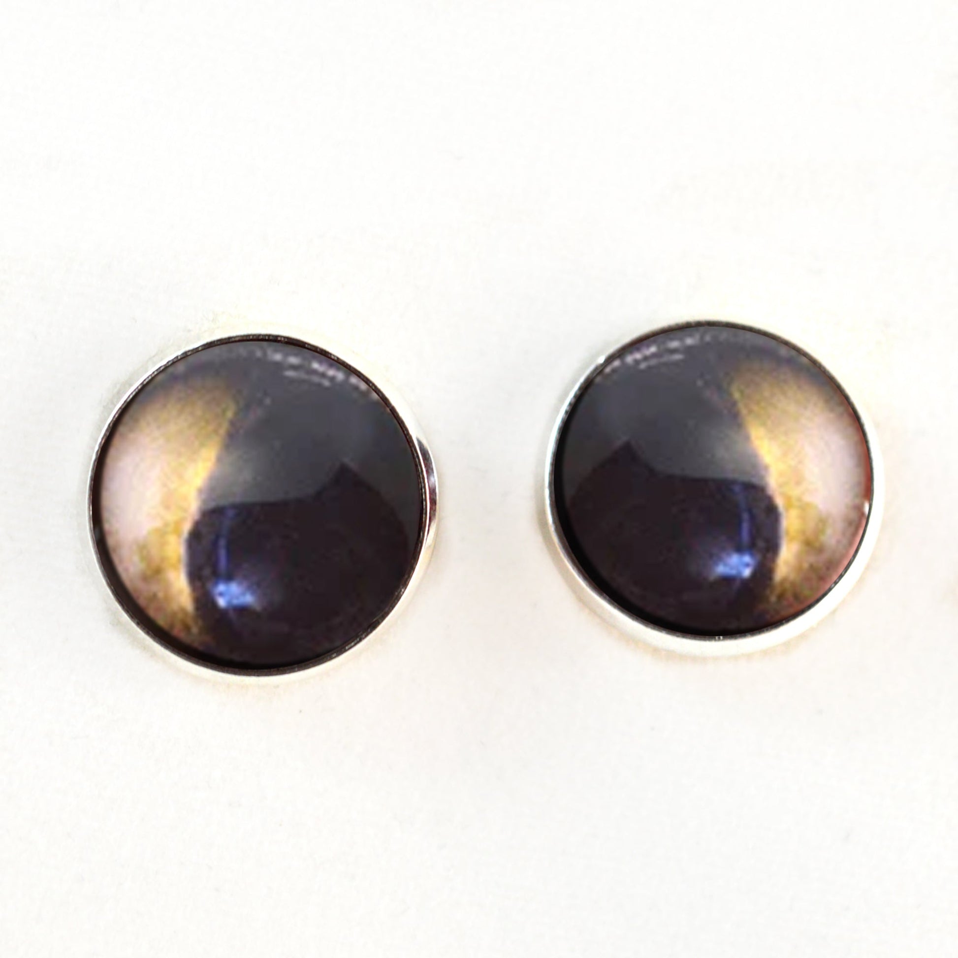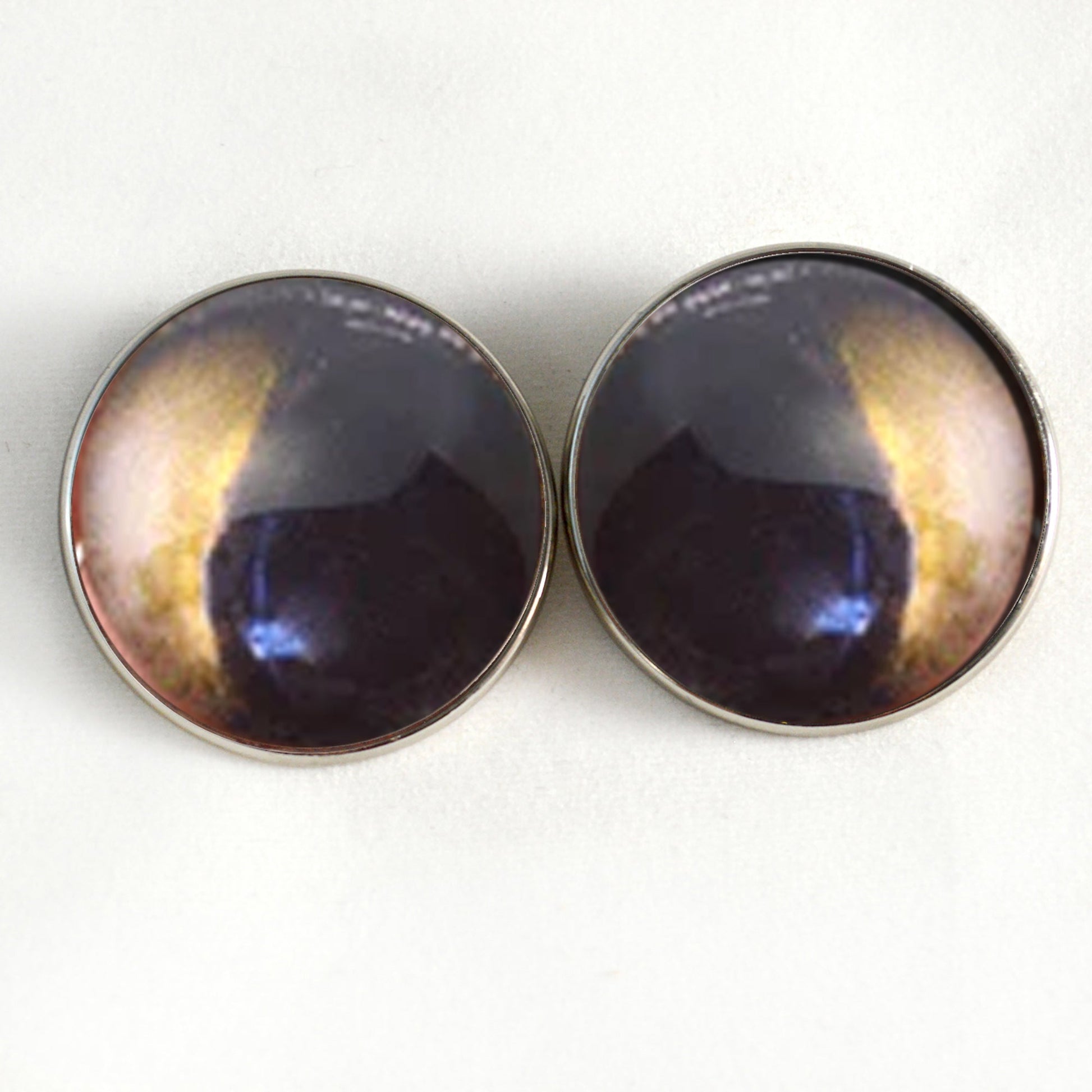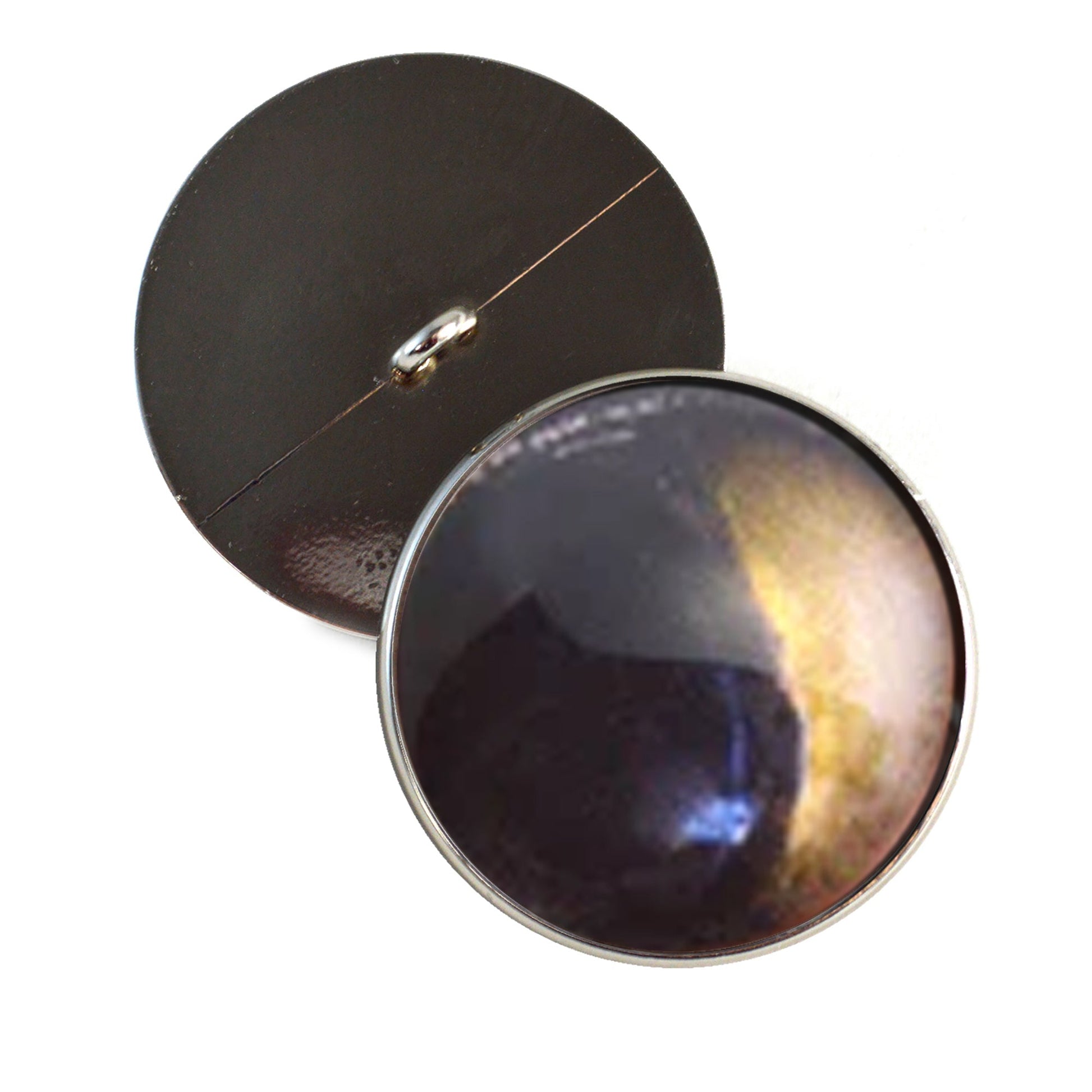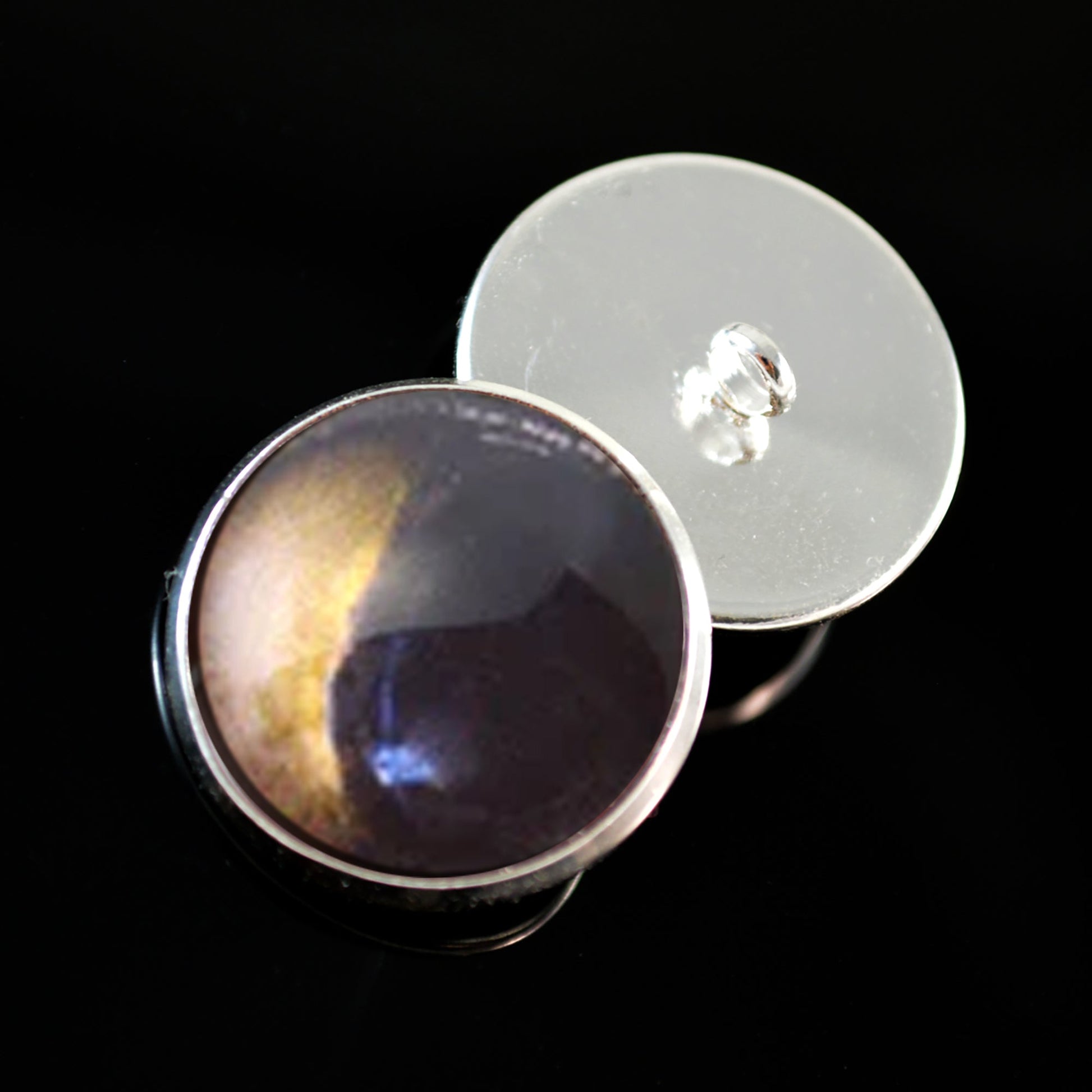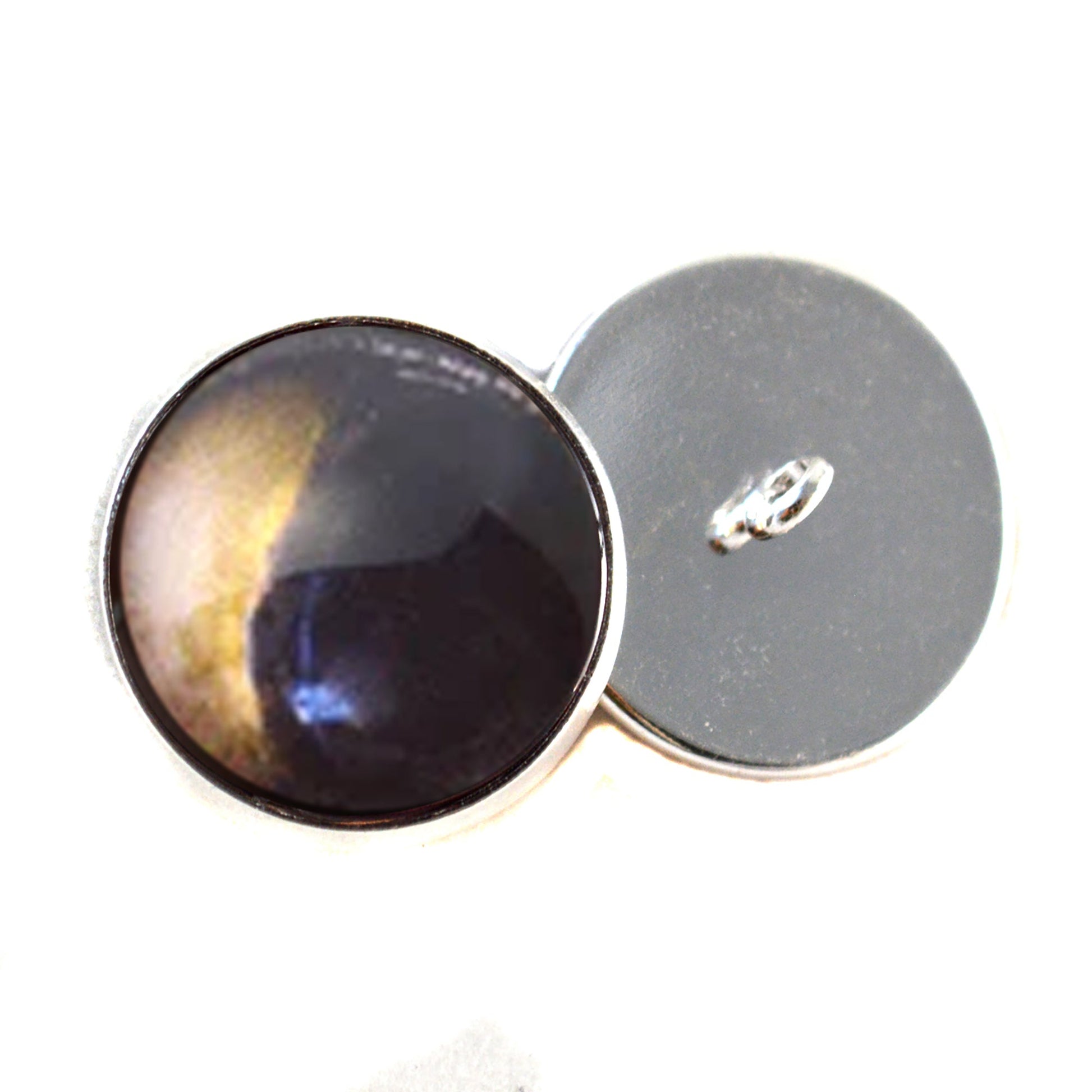 These button-backed cabochons are made with high quality card stock print-out of the original digital designs and attached to a glass cabochon dome with diamond glaze resin and attached to the silver toned button setting.
