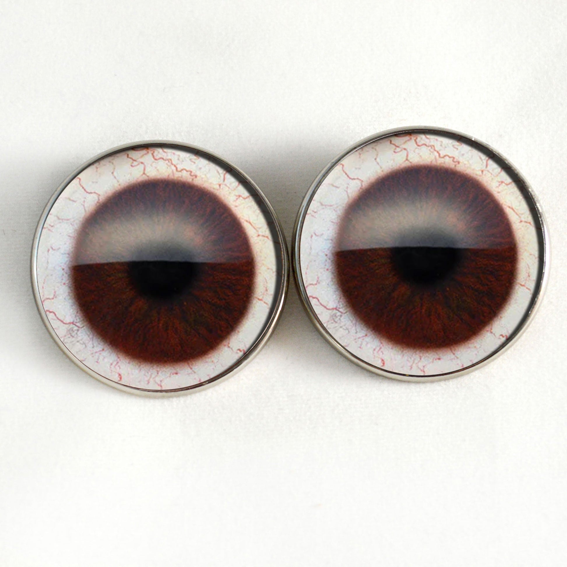These glass eyes are buttons with loops on the back of their silver-colored metal settings. This pair of glass eyes is perfect for creating your stuffed or crochet animal creature or soft sculpture, or for use in creative jewelry making.