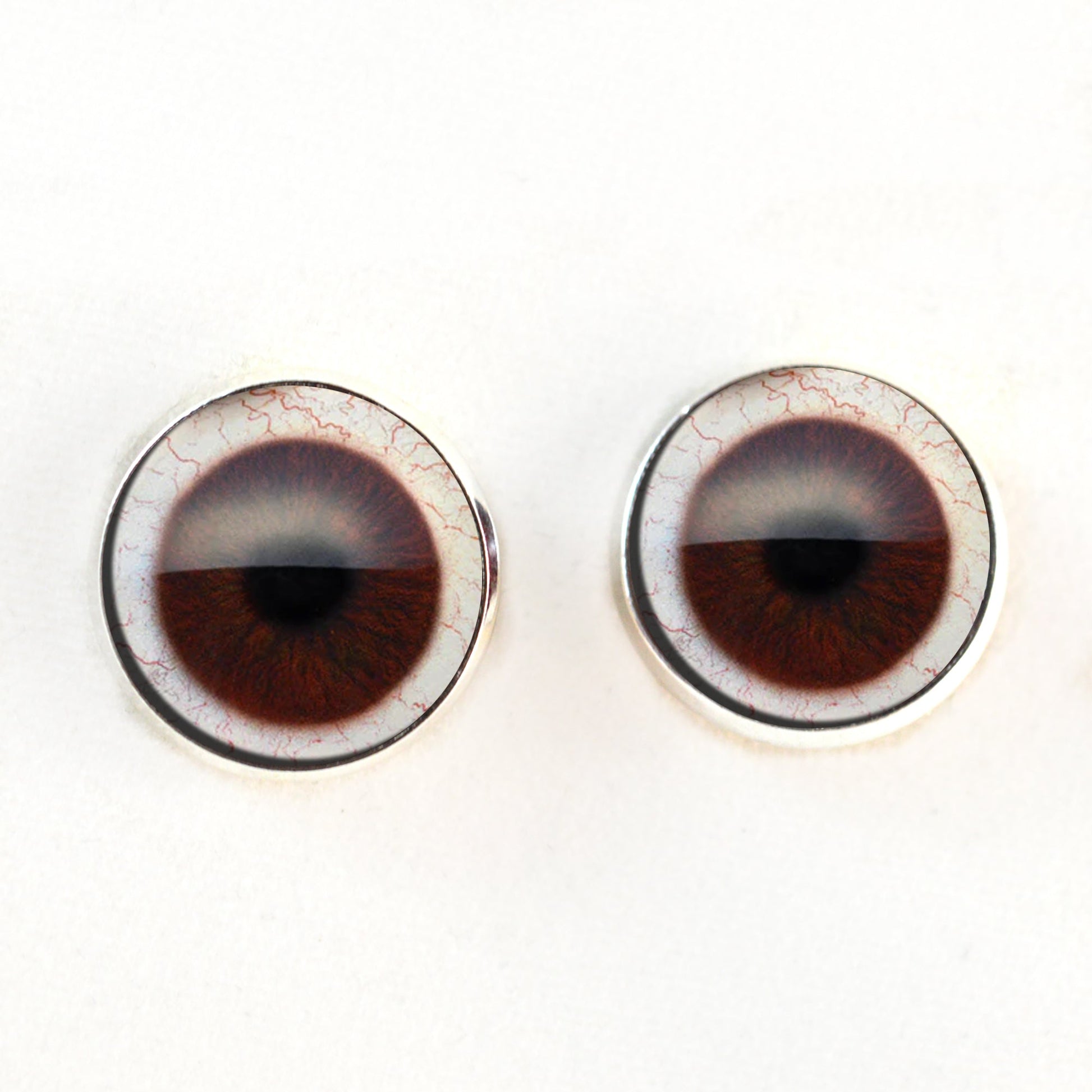 This glass eye design contains an intricate iris design in deep brown surrounding a solid black pupil, with realistically veined white scleras.