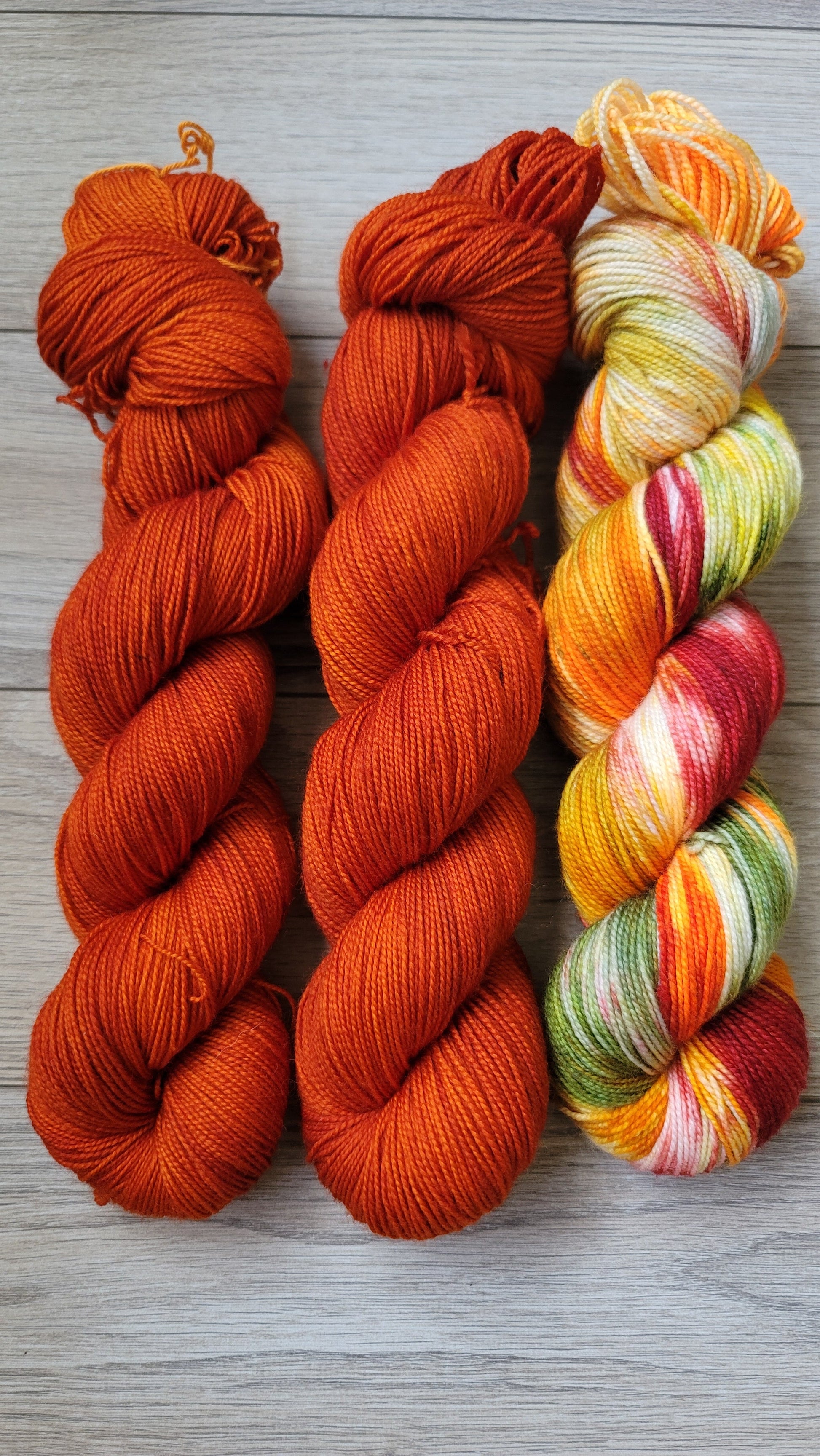 Each skein is personally hand dyed with colors that inspire! This Kit includes three 100g skeins in the base of your choice. 2 serve as the main color and one skein as the accent color. 300g total refer to below for yardage depending on base. Perfect for colorwork!