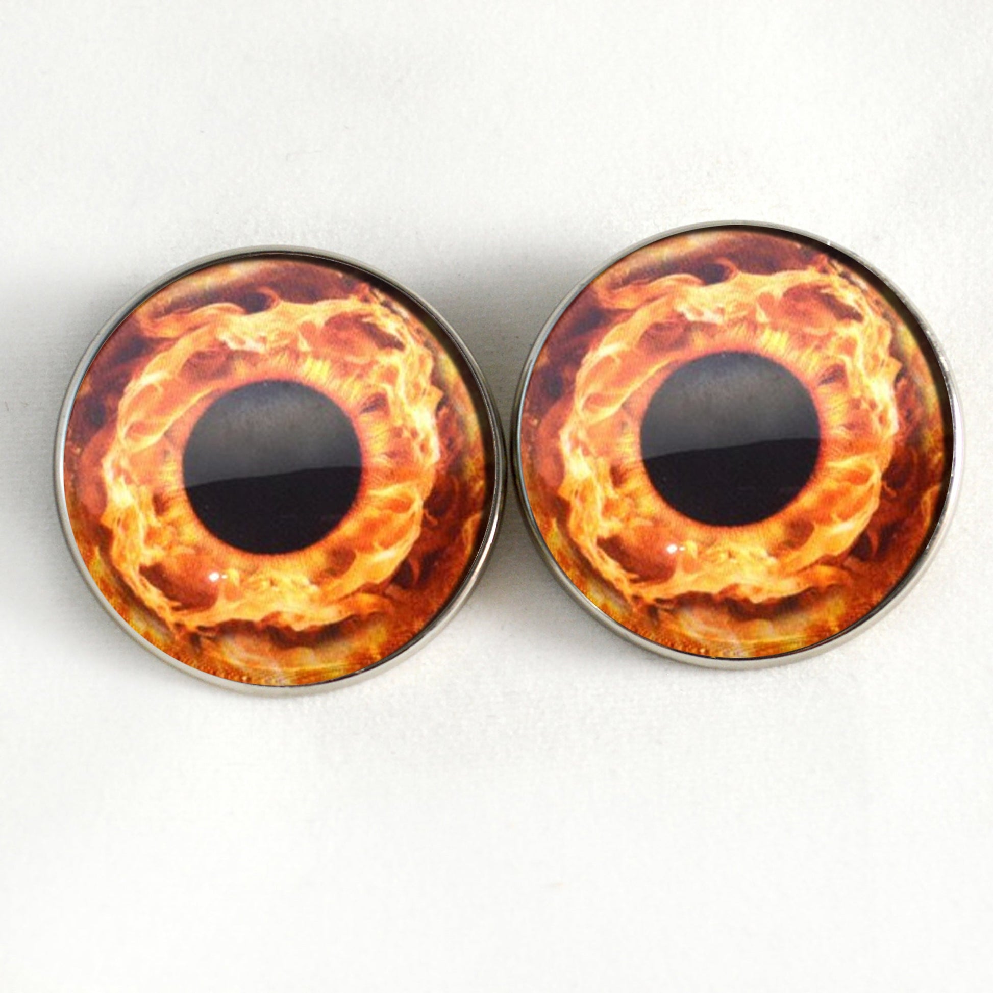These detailed, majestic rounded pupil fire glass eyes will mesmerize with the intricate iris detail in this set of orange flame inspired pair of eyes. Sharp and richly shaded colors draw the eye and allow for easy placement on art dolls, jewelry, sculptures, props, cosplay decorations, or anywhere else you can think of!