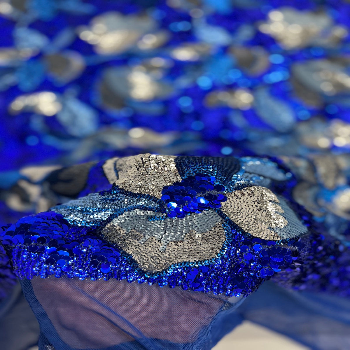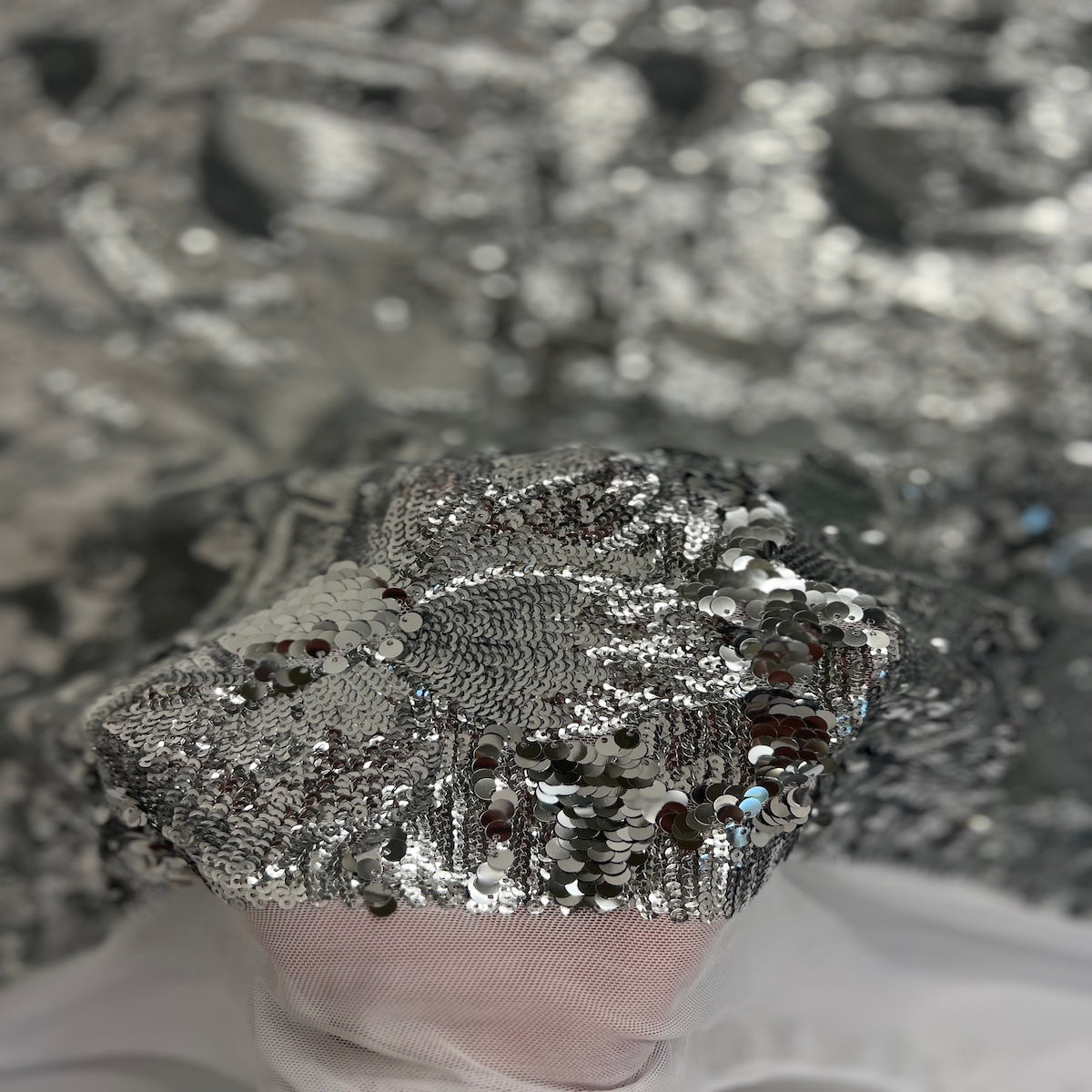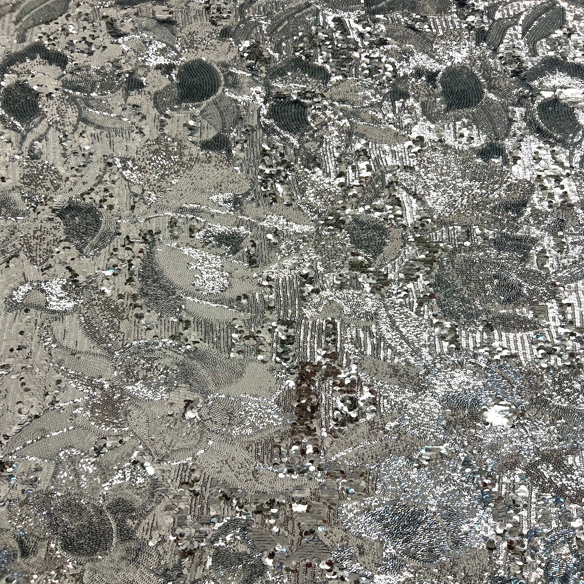 Crafted with heavy-weight sequins, this fabric features a stunning floral design, intricately composed of four different types of sequins, creating an eye-catching allure perfect for various applications.
