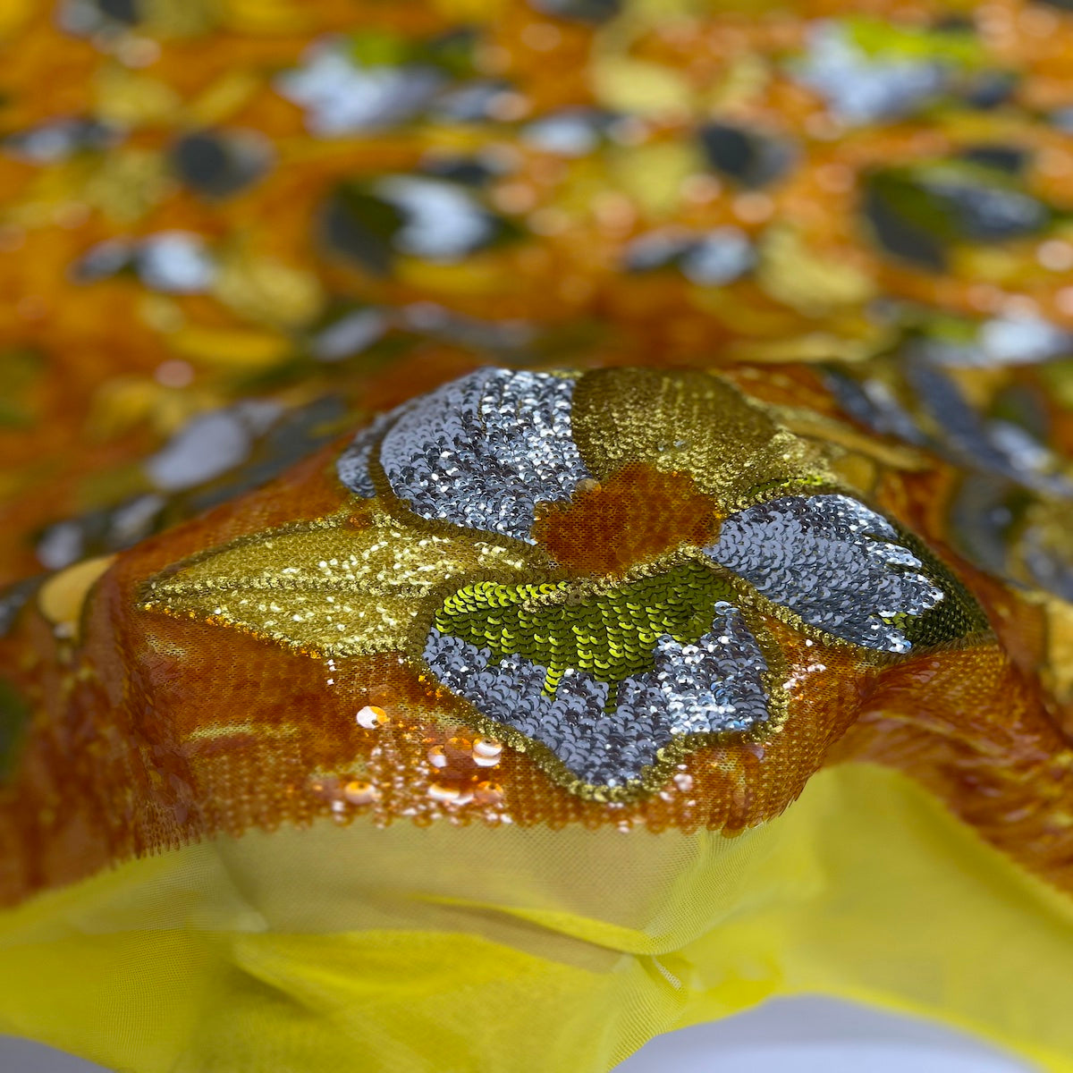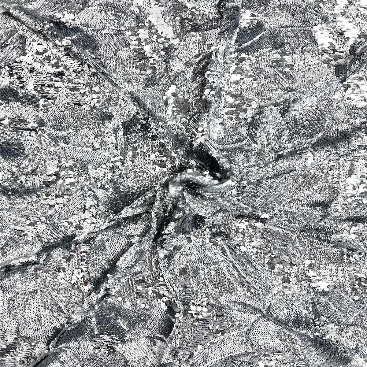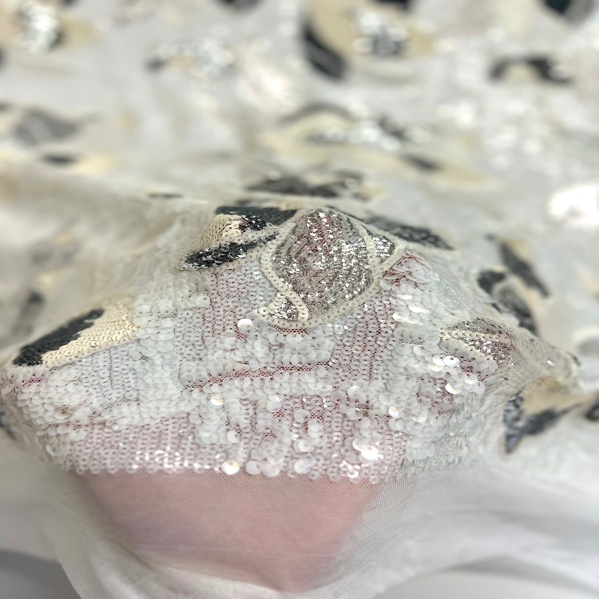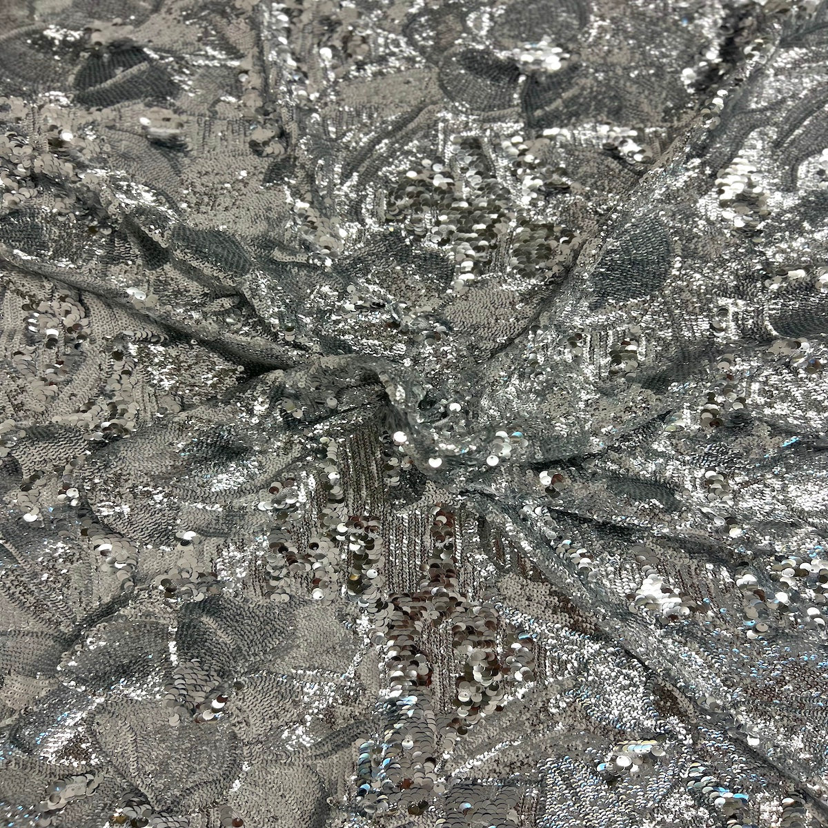 Crafted with heavy-weight sequins, this fabric features a stunning floral design, intricately composed of four different types of sequins, creating an eye-catching allure perfect for various applications.