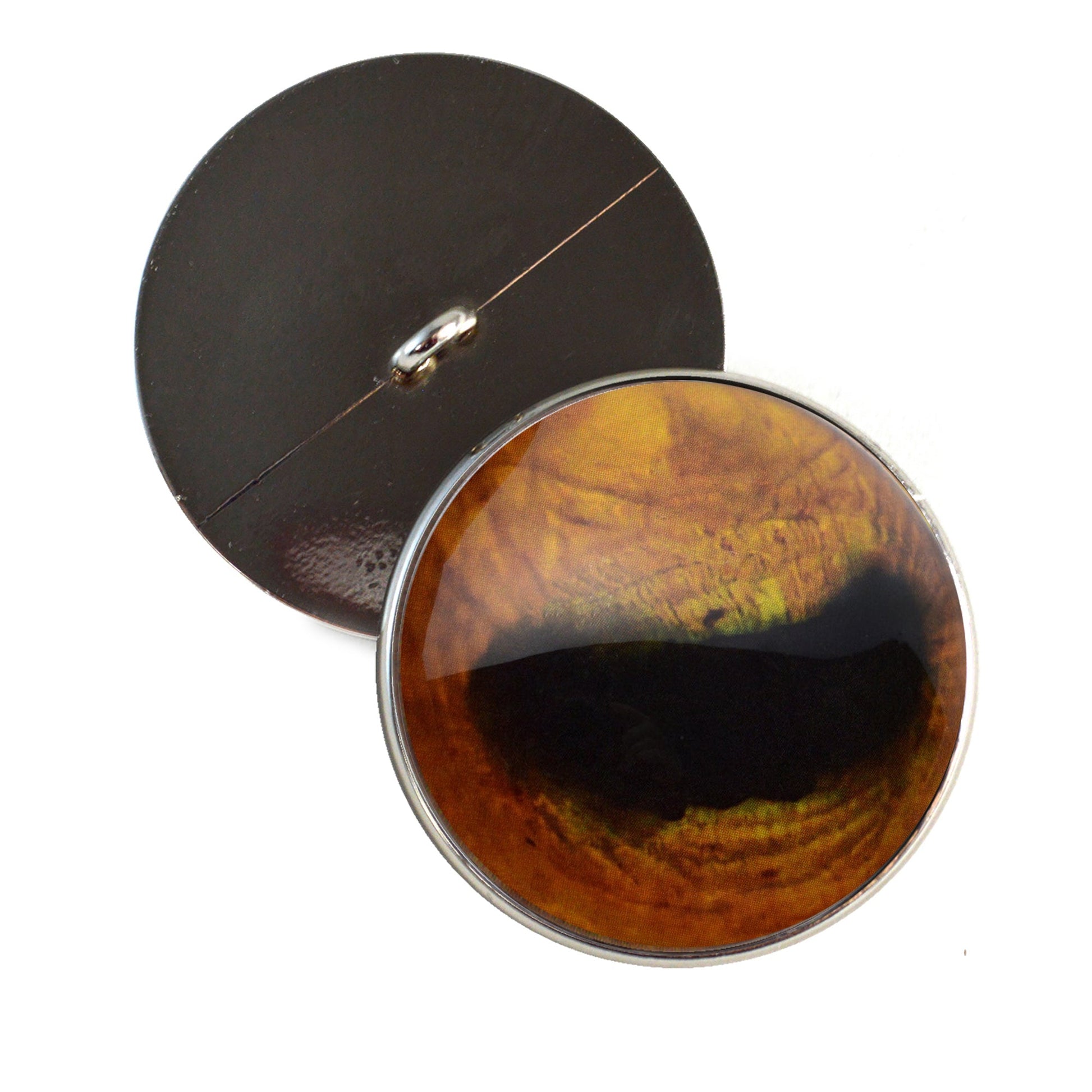 These glass eye cabochons are set in silver toned metal button bezels with sew-on loops on their backs. These sew-on glass eyes are perfect for soft sculptures, plushies, stuffed animals, and as buttons for unique clothing.