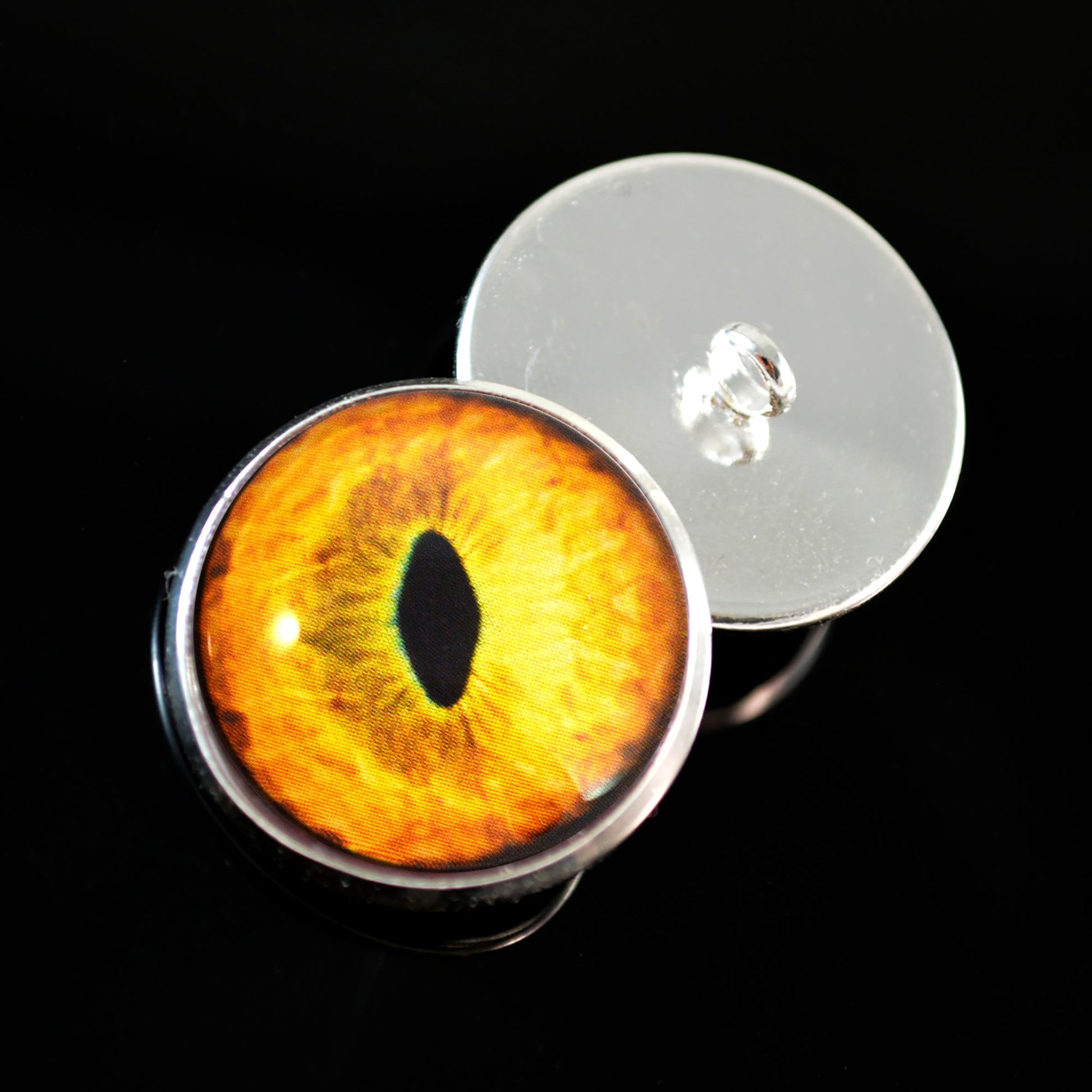 These glass eye cabochons are set in silver toned metal button bezels with sew-on loops on their backs. These sew-on glass eyes are perfect for soft sculptures, plushies, stuffed animals, and as buttons for unique clothing.