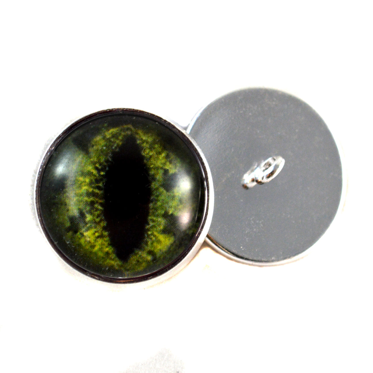 These compelling sew on button glass eyes depict riveting, green alligator eyes.