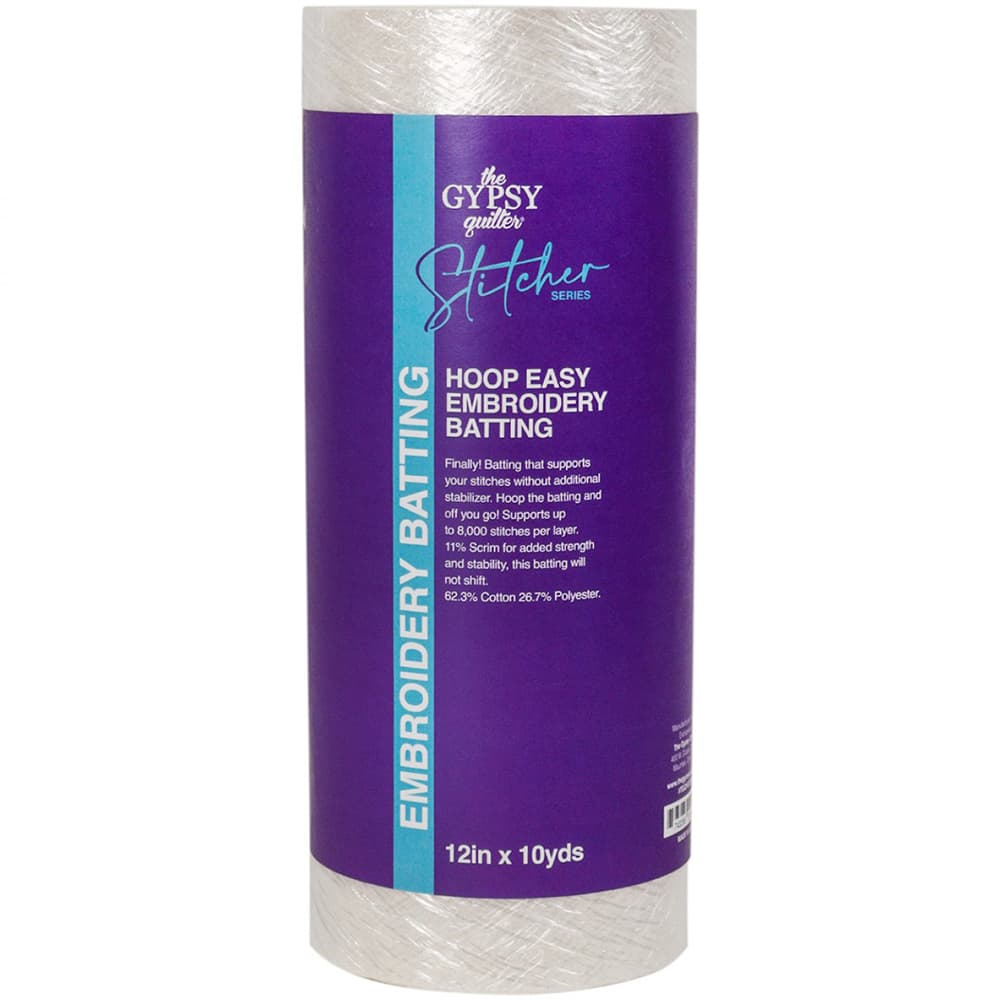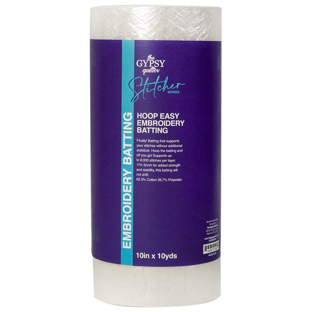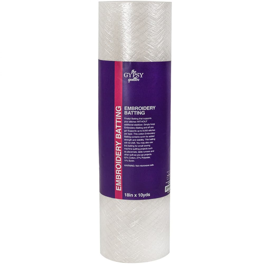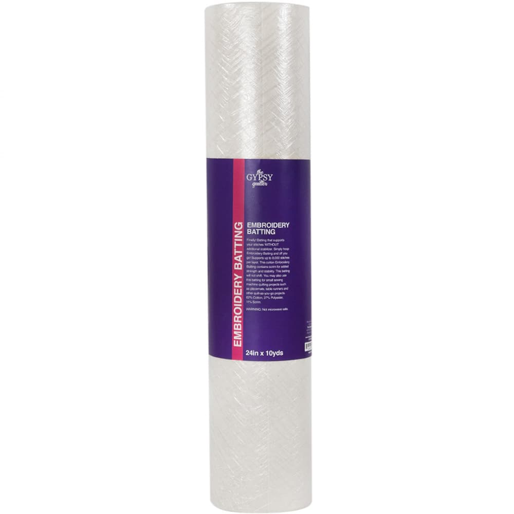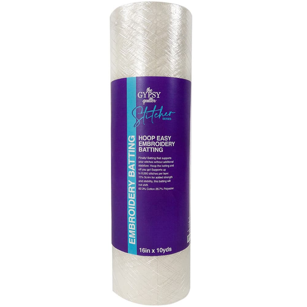 Get support for your stitches without additional stabilizer with Gypsy Quilter's Embroidery Batting. All you have to do is hoop the batting and you are ready to get started. You can also use the batting in small sewing machine projects like placemats, table runners, and more. It features scrim for added strength and stability, and best of all, it won't shift. Each roll holds 10-yards so that you can complete multiple tasks with just one roll. This needle punched batting can be quilted a maximum of eight inches between quilting lines and support up to 8000 stitches per layer. Made of 62% cotton, 27% polyester, and 11% scrim. Please note Gypsy Quilter's Embroidery Batting is NOT microwave safe. Choose from multiple widths: 10", 12", 16", 18", or 24".