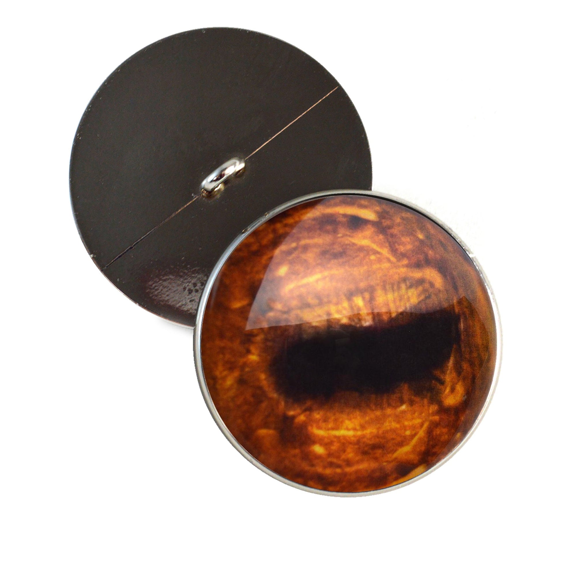 These glass eye cabochons are set in silver toned metal button bezels with sew-on loops on their backs. These sew-on glass eyes are perfect for soft sculptures, plushies, stuffed animals, and as buttons for unique clothing.