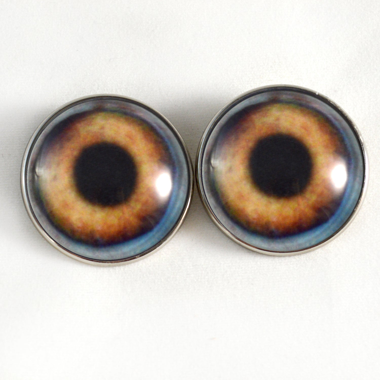 These glass eye cabochons are set in silver toned metal button bezels with sew-on loops on their backs. These sew-on glass eyes are perfect for soft sculptures, plushies, stuffed animals, and as buttons for unique clothing.