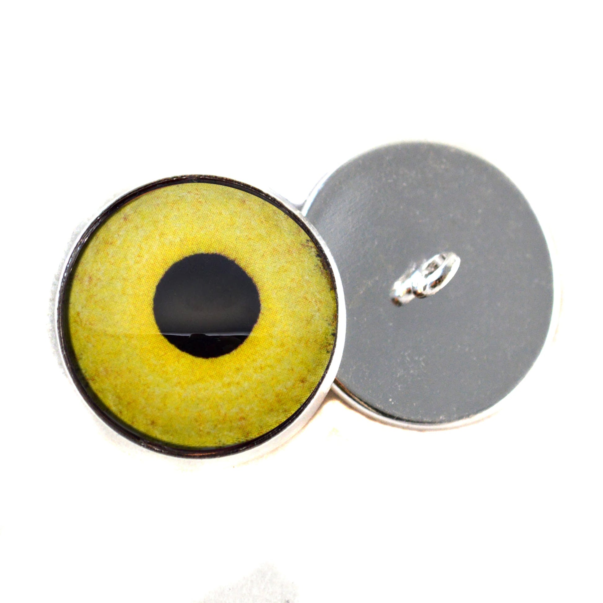 These glass eyes are buttons with loops on the back of their silver-colored metal settings. This pair of glass eyes are perfect for creating your stuffed or crochet animal creature or soft sculpture, or for use in creative jewelry making.