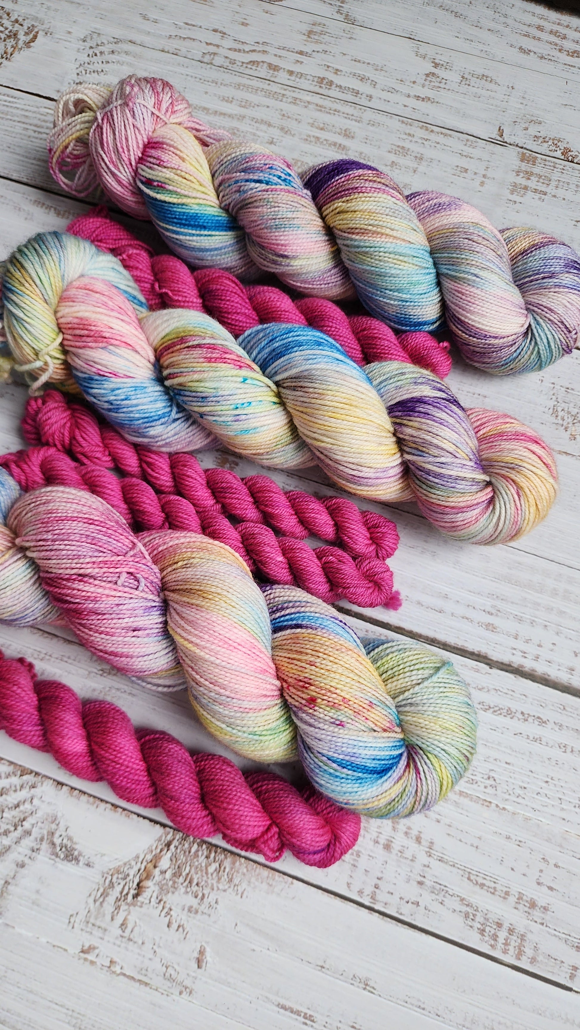 This hand dyed fiber set is perfect for sock knitting! Includes one, 100g skein and one, 20g mini with your choice to add on a matching handcrafted progress keeper