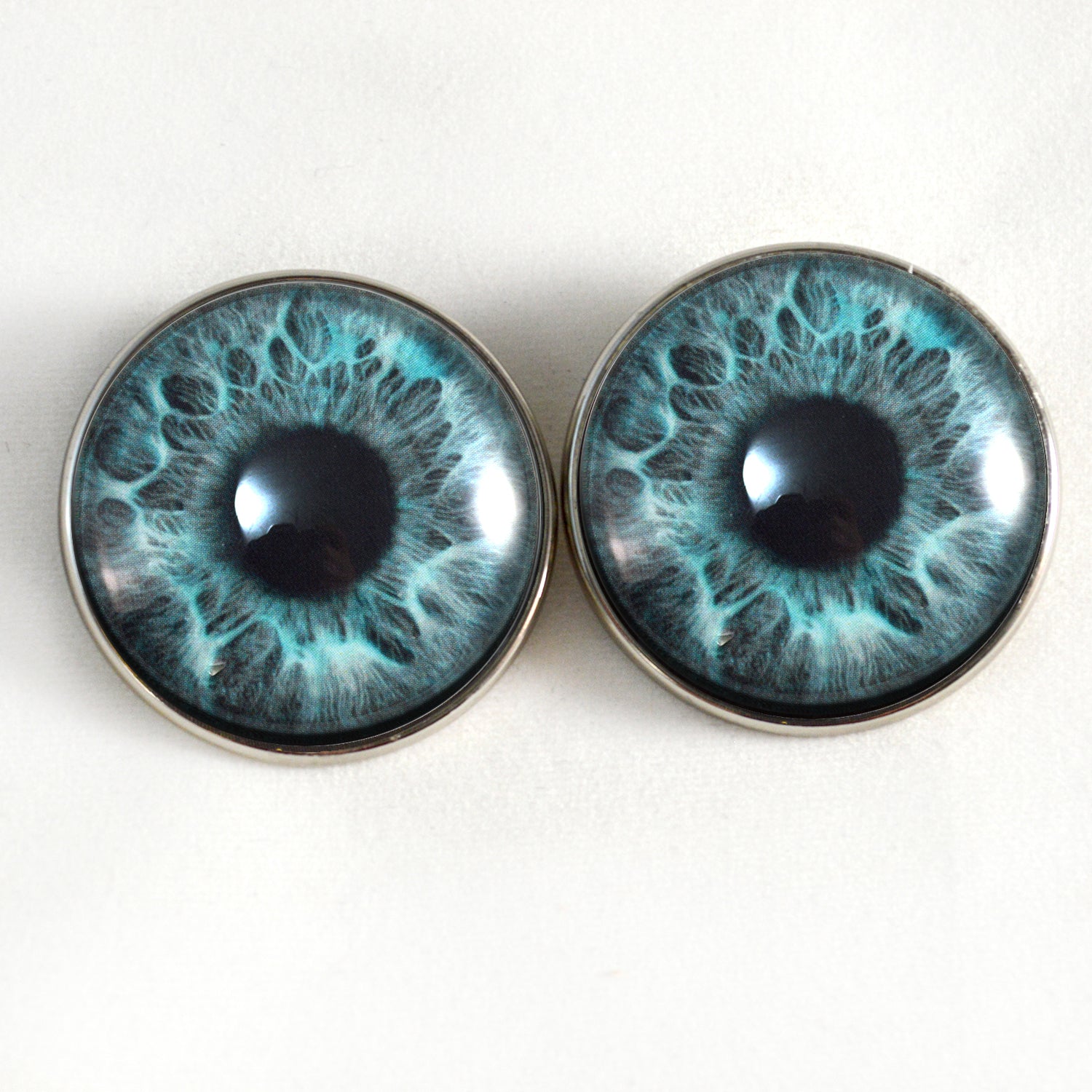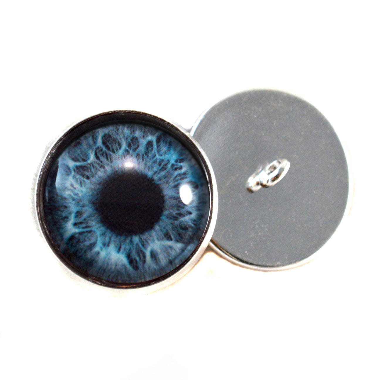 These glass eye cabochons are set in silver toned metal button bezels with sew-on loops on their backs. These sew-on glass eyes are perfect for soft sculptures, plushies, stuffed animals, and as buttons for unique clothing.