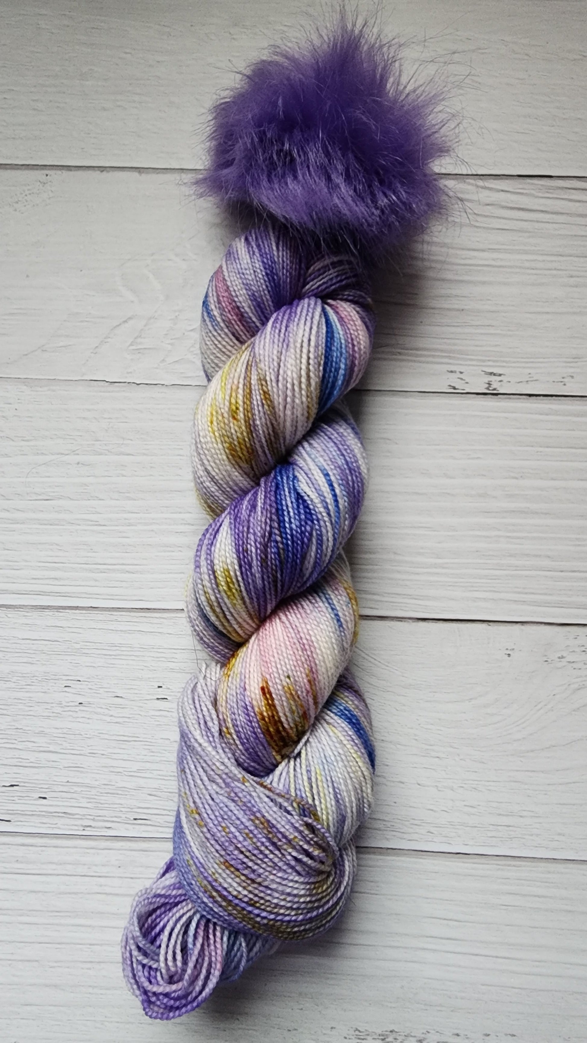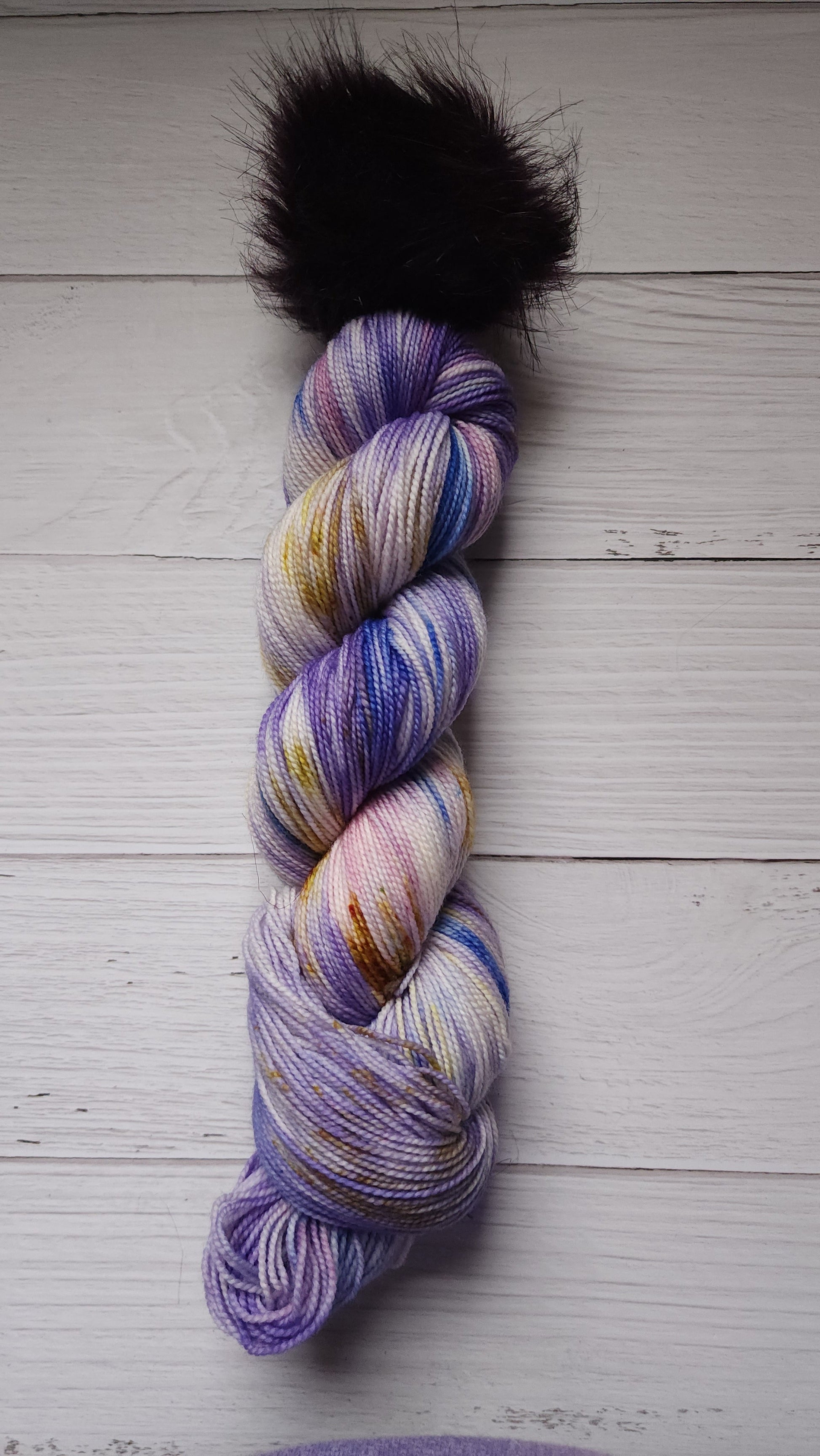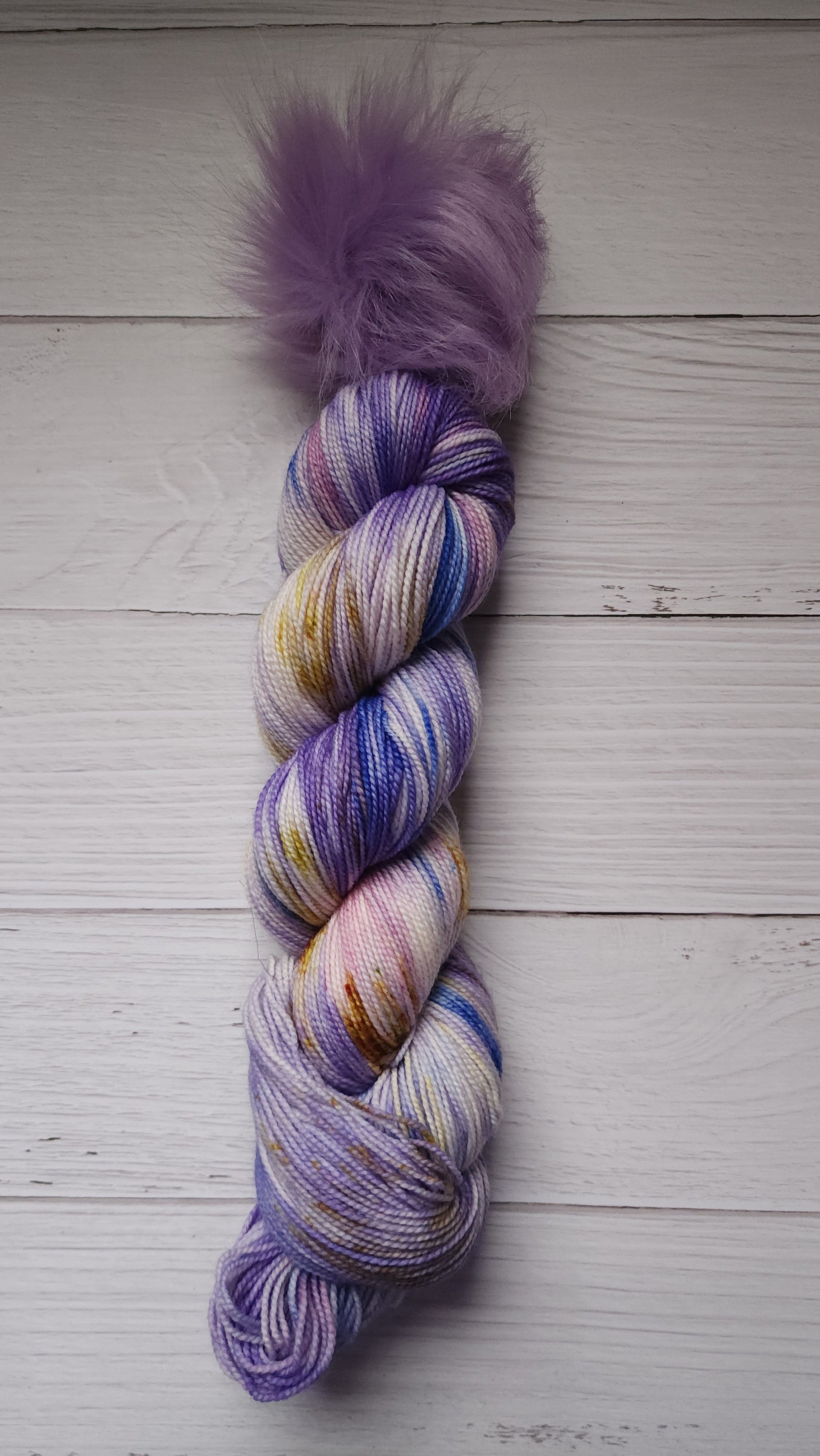 Each skein is personally hand dyed with colors that inspire! This hand dyed fiber is perfect for beanies and other hats! Each kit comes with one 100g skein and a fluffy 4 inch pom pom!