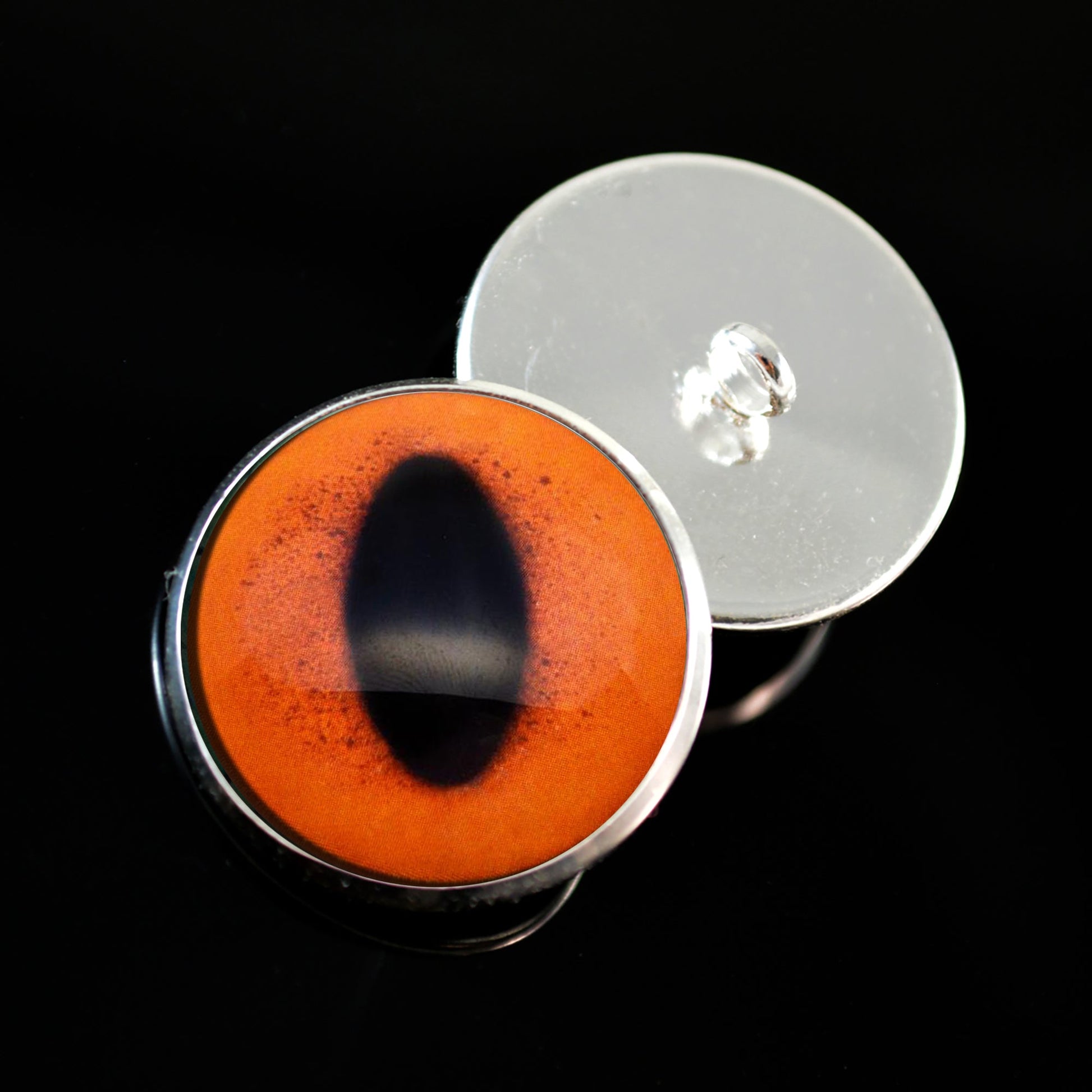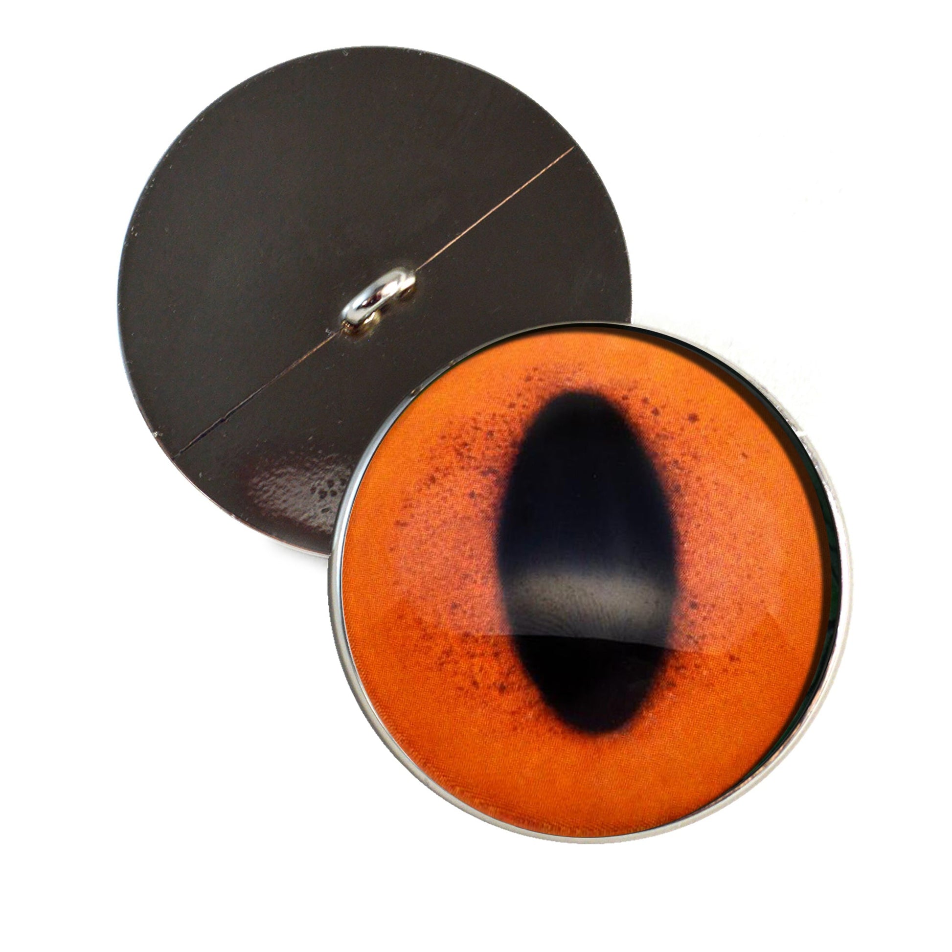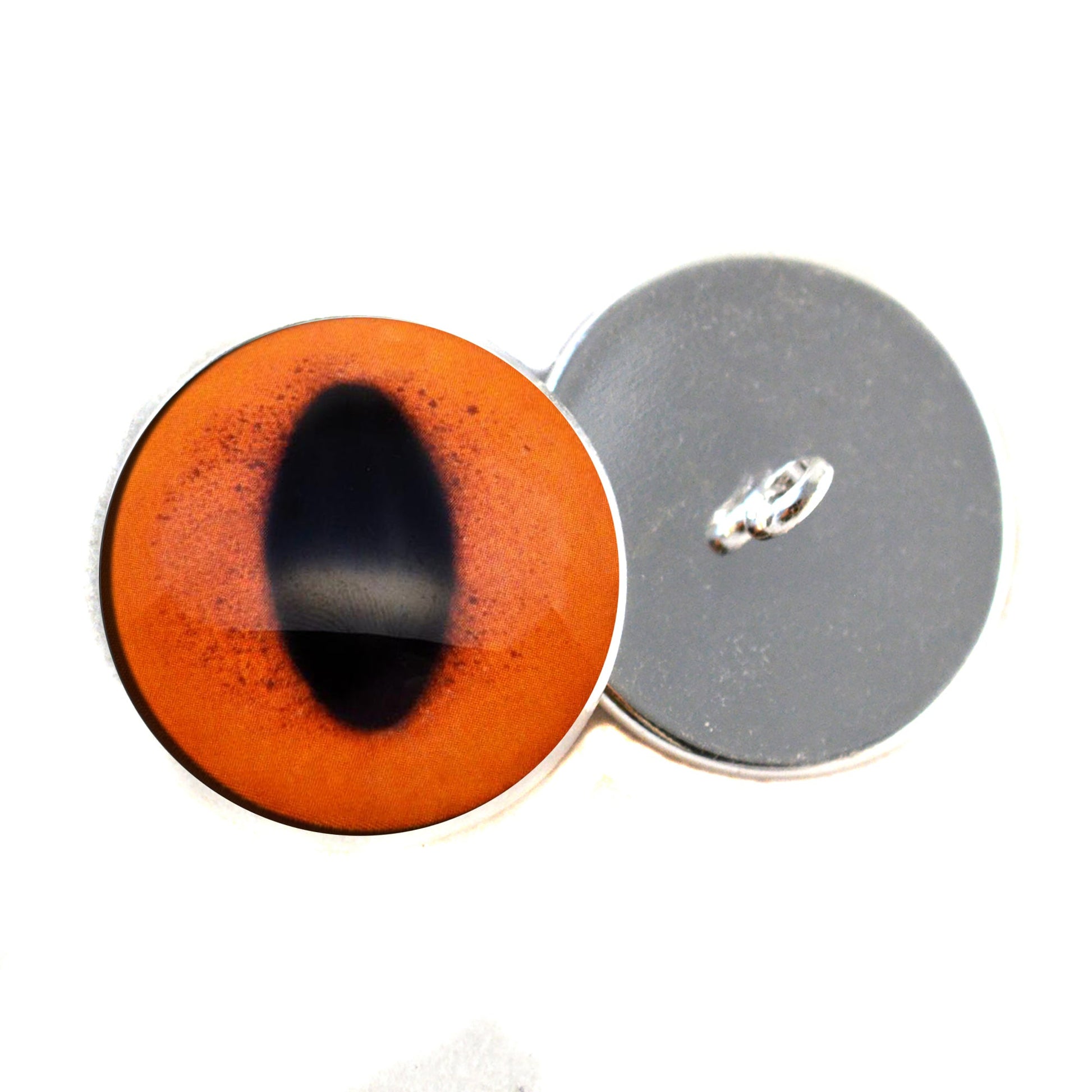 These glass eye cabochons are set in silver toned metal button bezels with sew-on loops on their backs. These sew-on glass eyes are perfect for soft sculptures, plushies, stuffed animals, and as buttons for unique clothing.