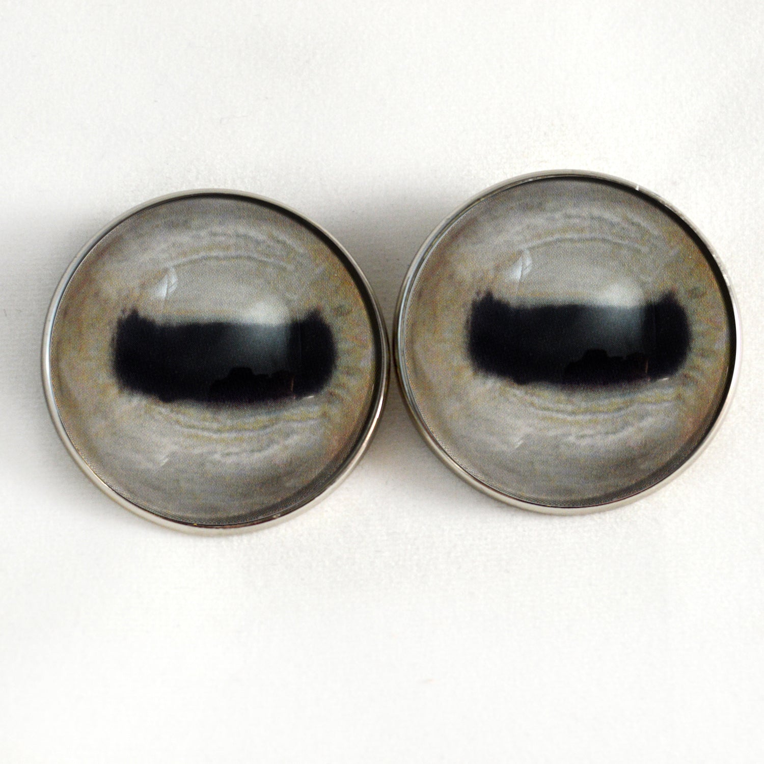 These glass eye cabochons are set in silver toned metal button bezels with sew-on loops on their backs. These sew-on glass eyes are perfect for soft sculptures, plushies, stuffed animals, and as buttons for unique clothing.