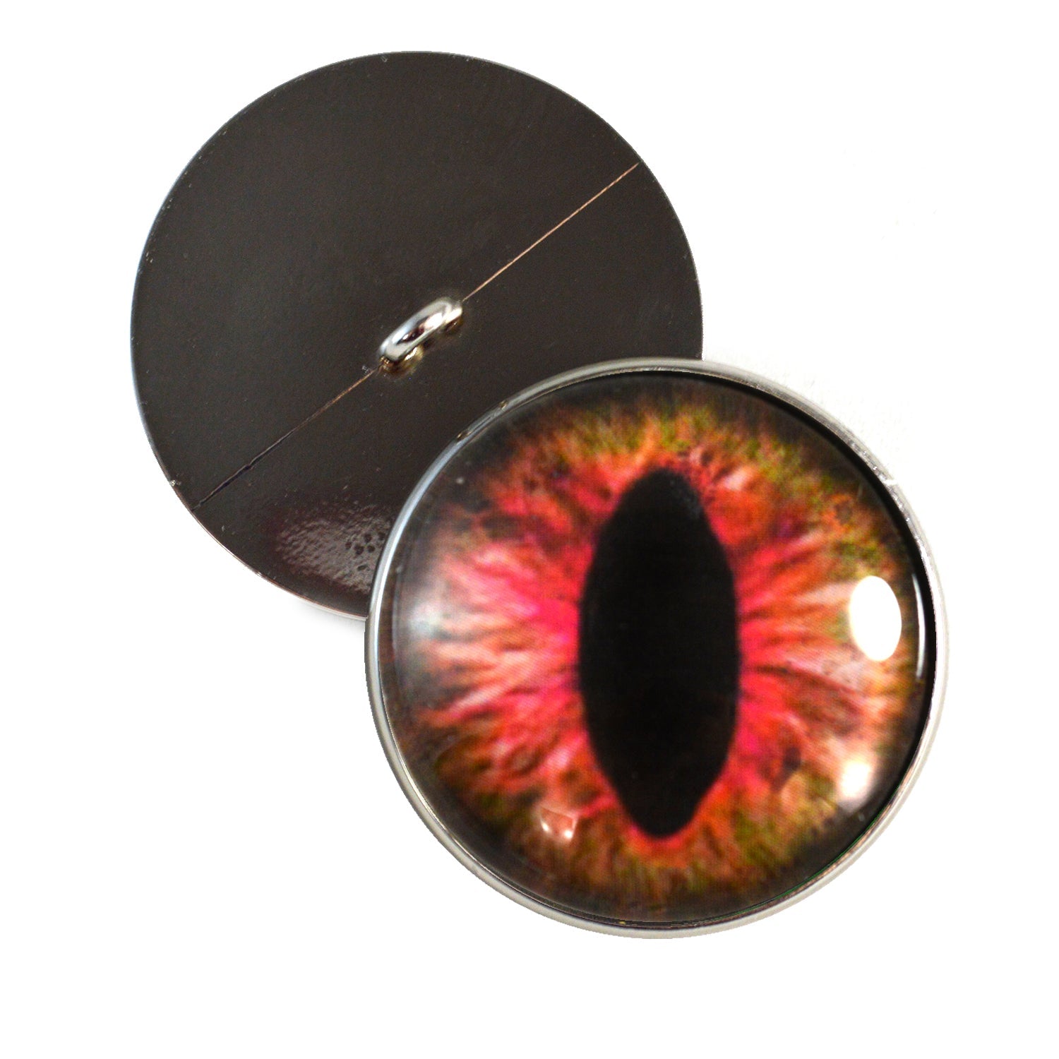 These glass eye cabochons are set in silver toned metal button bezels with sew-on loops on their backs. These sew-on glass eyes are perfect for soft sculptures, plushies, stuffed animals, and as buttons for unique clothing.