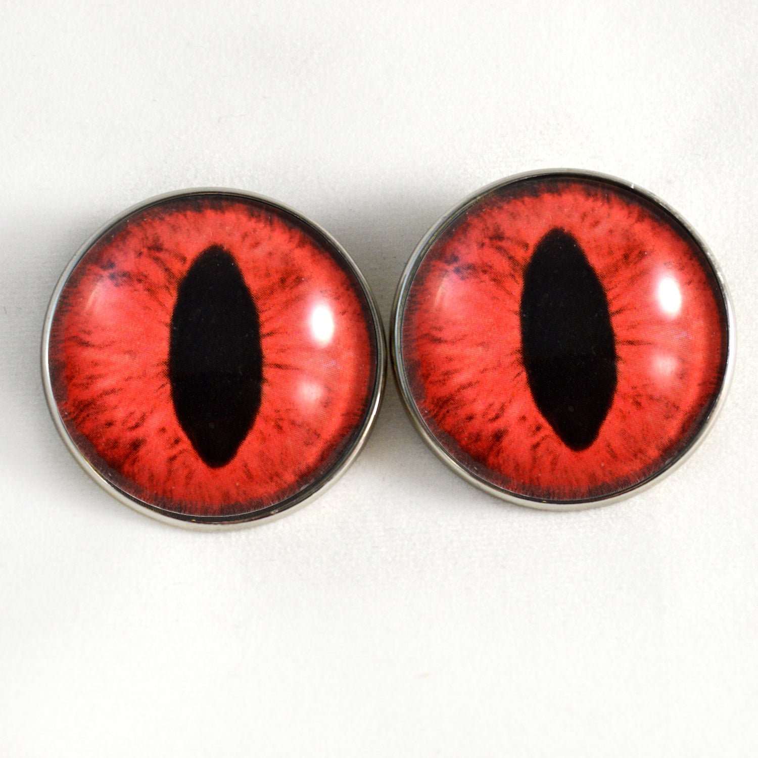 These captivating sew on button glass eyes depict intense, red cat or dragon eyes.