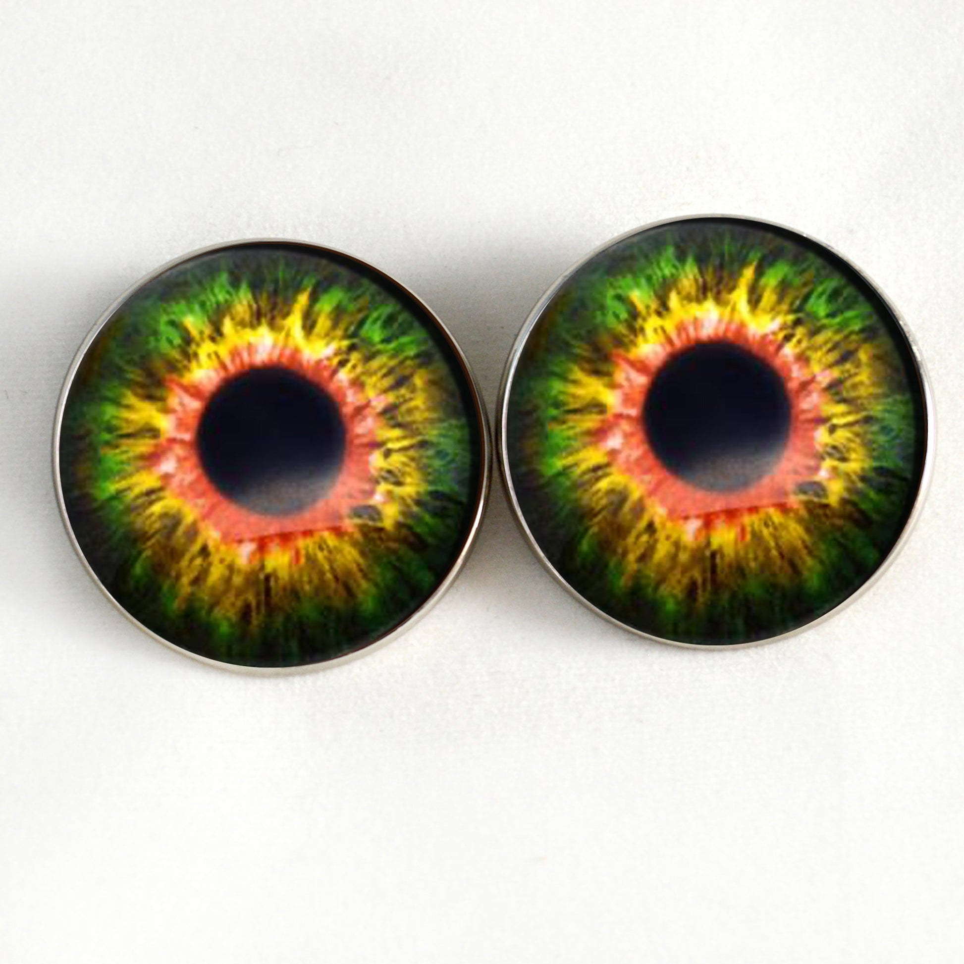 These realistic sew on button glass eyes depict life-like, Sensational Green and Orange Creature eyes.