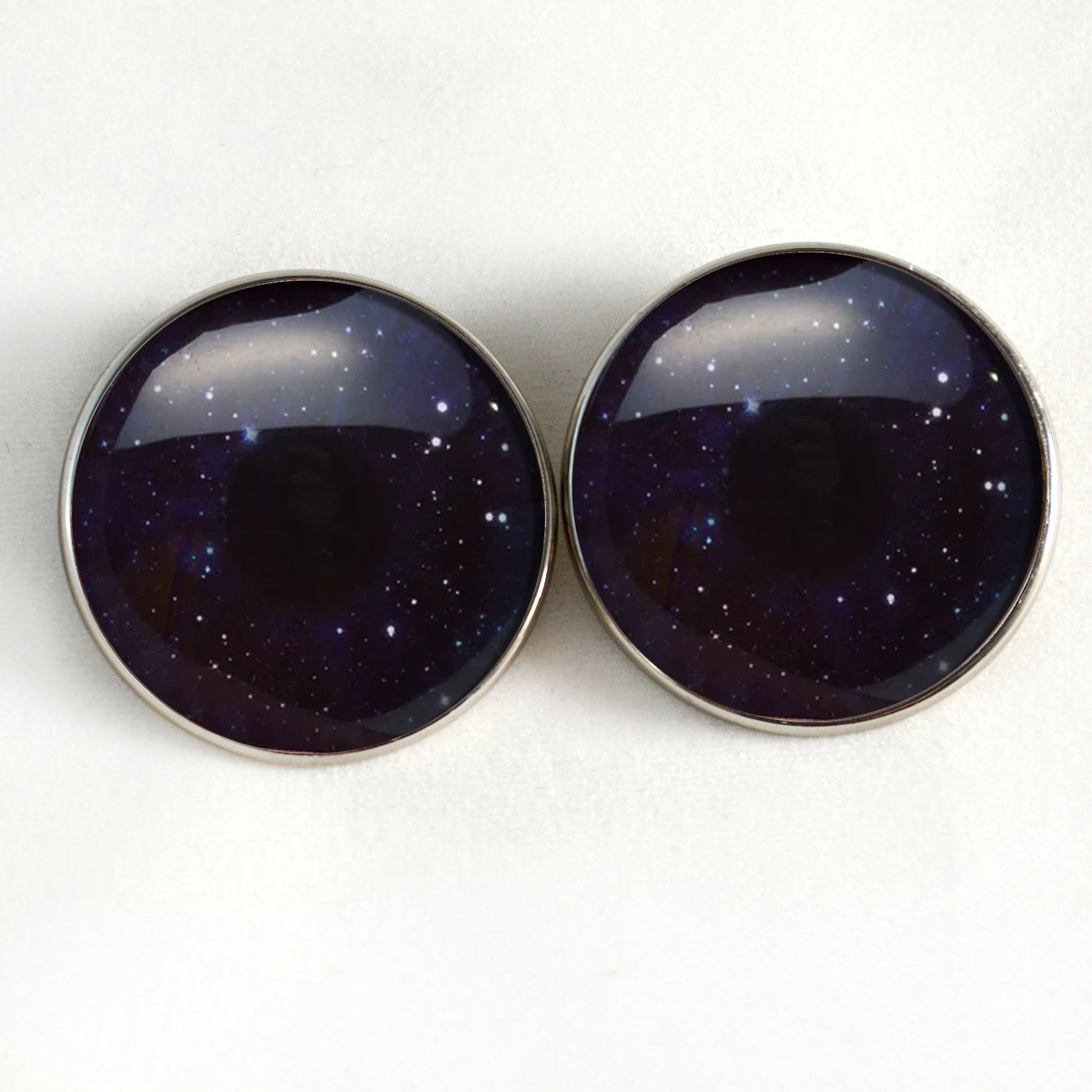 This glass eye design contains a Iris with an abstract dark night sky with stars, solid black circle shaped pupil in the middle of each iris.