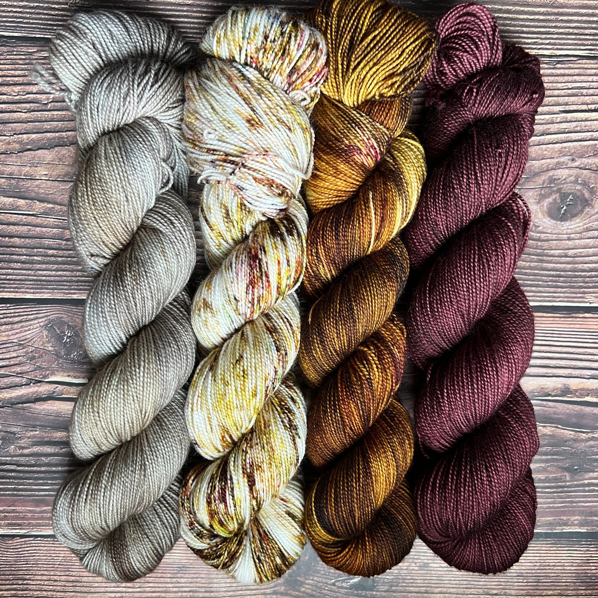 Each skein is personally hand dyed with colors that inspire! This Kit includes four 100g skeins in the base of your choice. This kit is perfect for the winter lights shawl by Stephen West. 400g total refer to below for yardage depending on base. Perfect for colorwork!